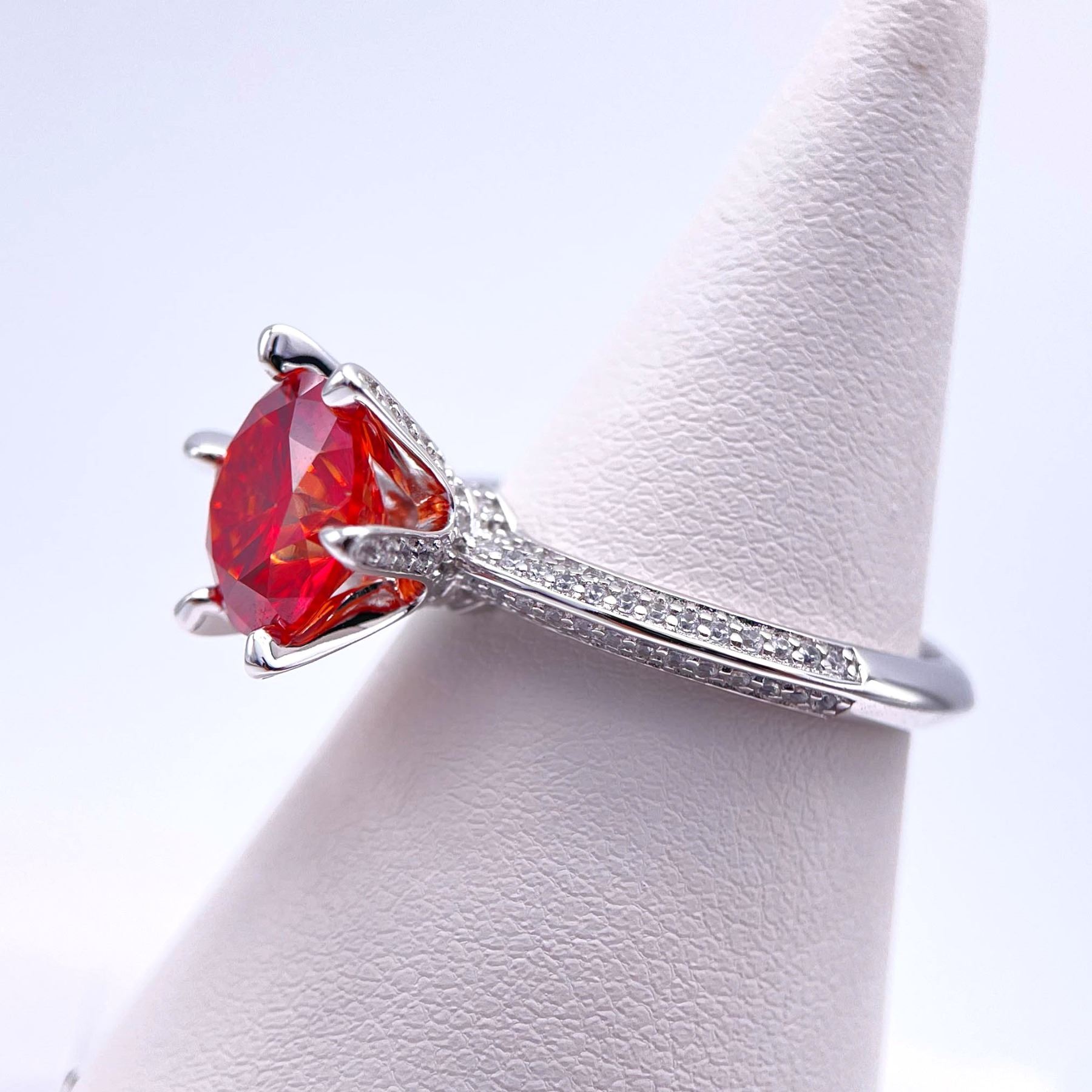 This Fine 3 Ct Moissanite Centerstone is a VVS1 Brilliant Round Cut Measuring 9 mm. The Color a Vivid Bright Red. This Fire Moissanite is near flawless and bursting out with a full spectrum of colors and complimented by 124 accent stones. It is mounted in .925 solid sterling silver complimented 14 Kt White Gold Overlay, which gives the ring its high polish and shine. It is also tarnish resistant. With a refractive index of 2.65-2.69 exhibits more brilliance than a diamond thanks to a dispersion that is 2.4 times higher than a natural diamond. It is also conflict free and earth friendly. This exceptional Moissanite measures 9.25 on the Mohs hardness scale and will test positive for a diamond with almost any diamond tester. Ring size 7. Total gram wt. is approx. 4 total grams.