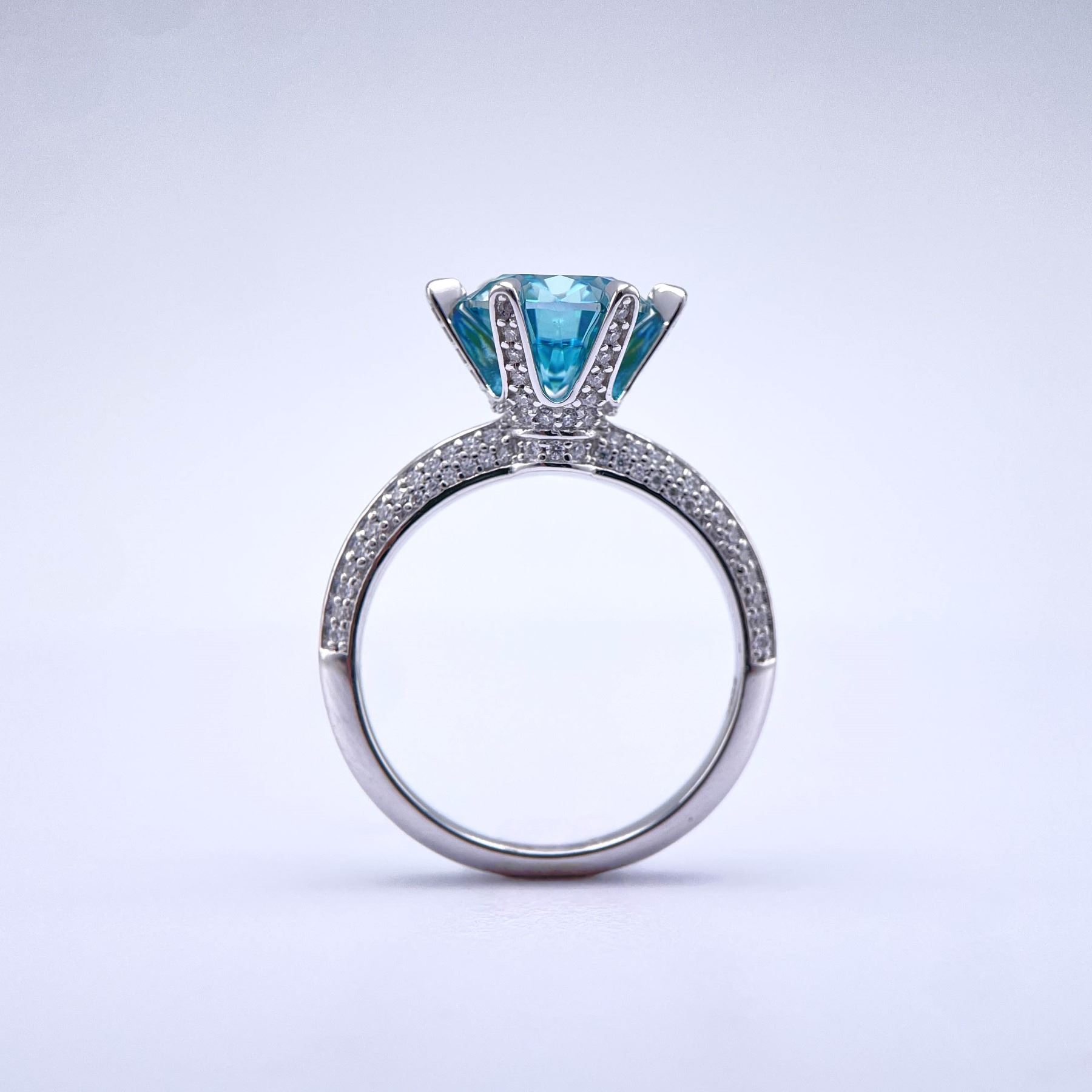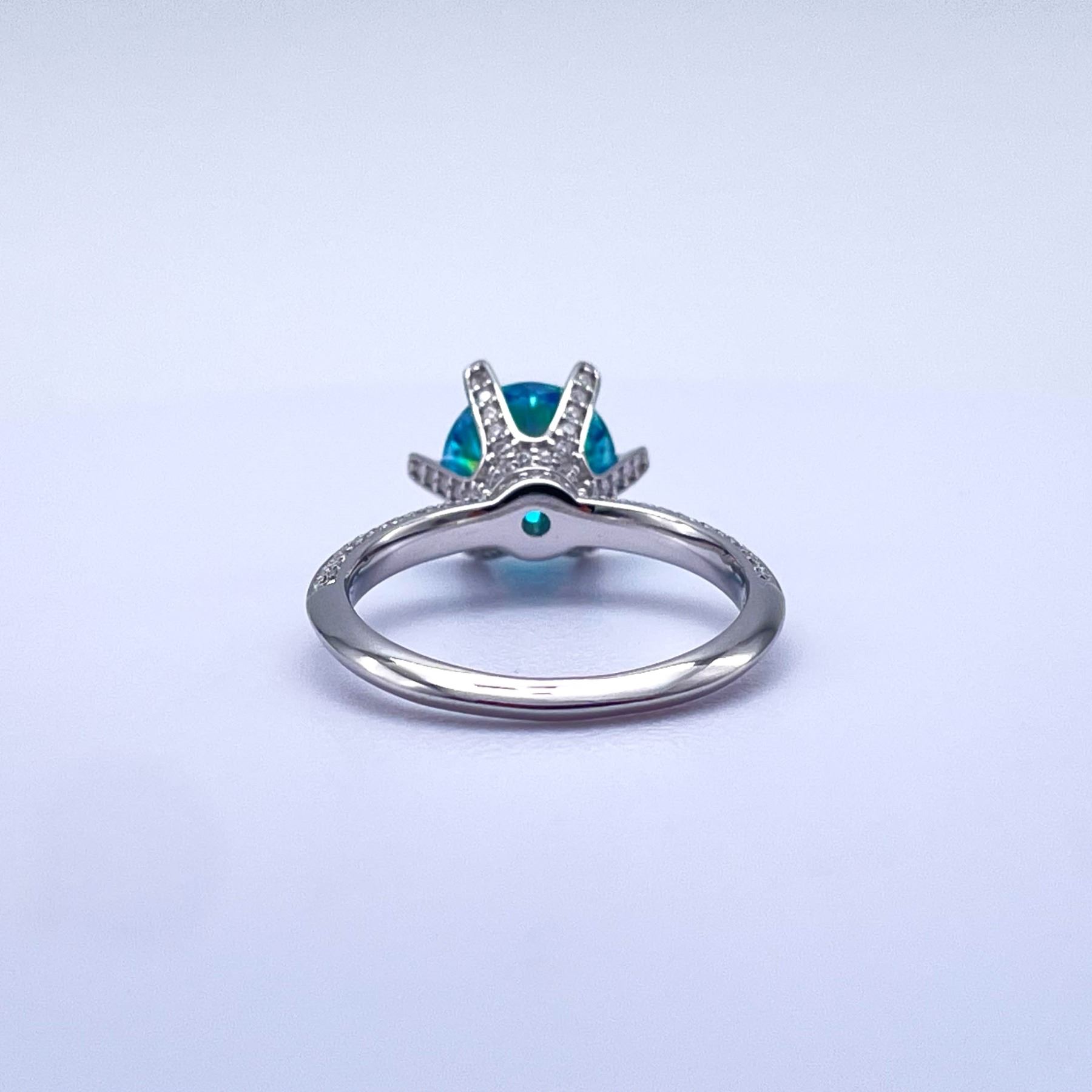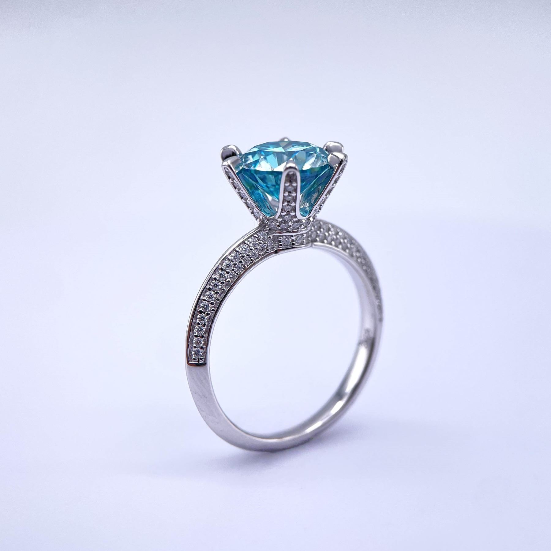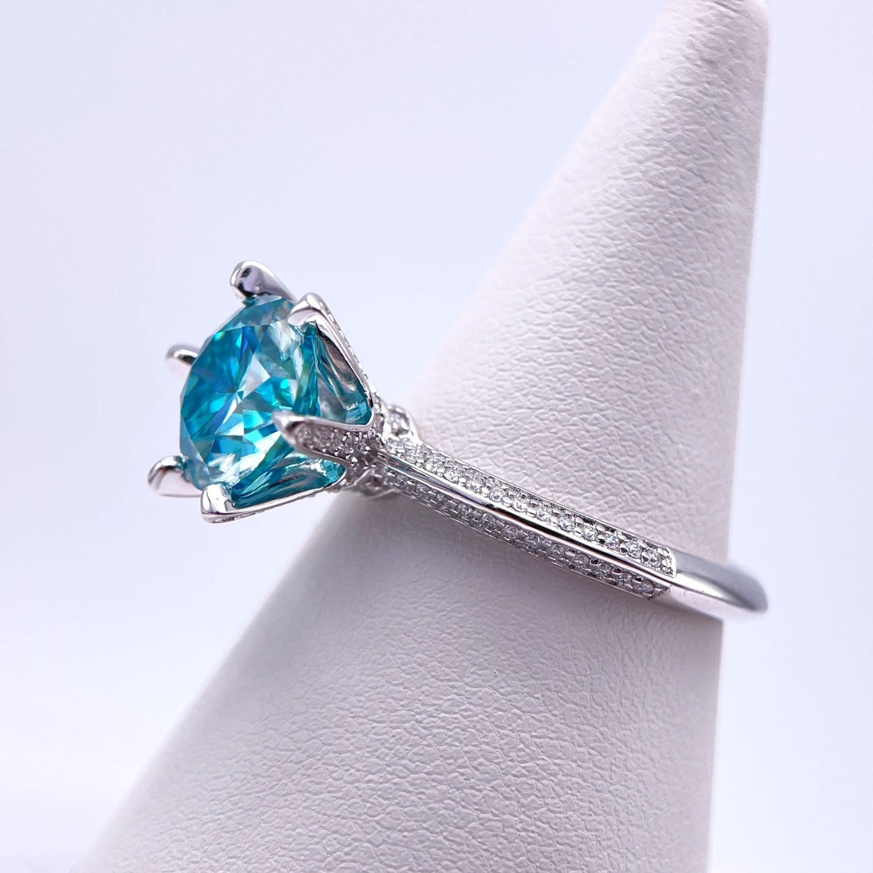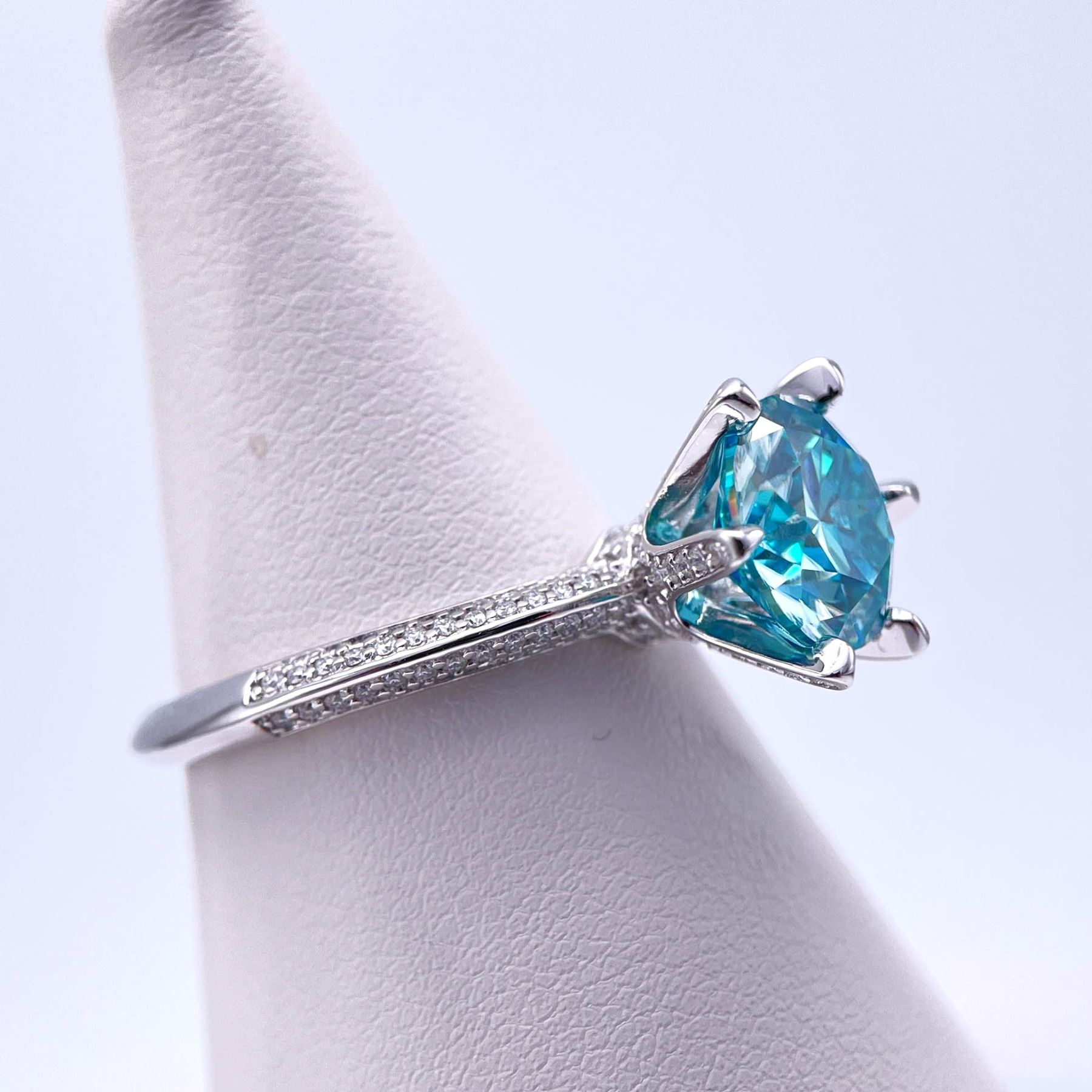 This Fine 3 Ct Moissanite Centerstone is a VVS1 Brilliant Round Cut Measure sing 9 mm. It has a gorgeous vivid Swiss Blue Hue. This Fire Moissanite is near flawless and bursting out with a full spectrum of colors and complimented by 124 clear whiter faceted accent stones. It is mounted in 14 Kt White Gold Plate over Solid .925 Sterling Silver, The 14 Kt White Gold overlay gives the ring its high polish and shine. It is also tarnish resistant. With a refractive index of 2.65-2.69 exhibits more brilliance than a diamond thanks to a dispersion that is 2.4 times higher than a natural diamond. It is also conflict free and earth friendly. This exceptional Moissanite measures 9.25 on the mohs hardness scale and will test positive for a diamond with almost any diamond tester. Ring size 8. Total gram wt is approx. 4.2 total grams.