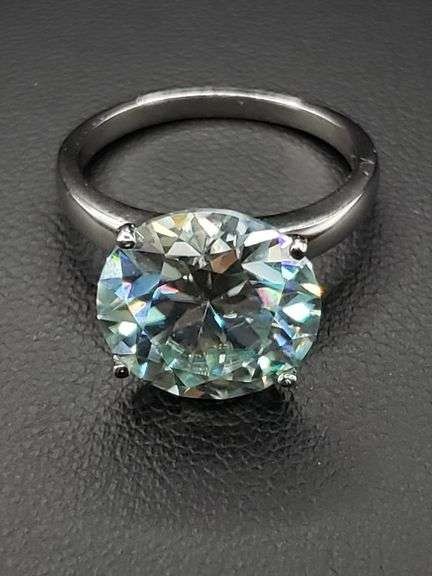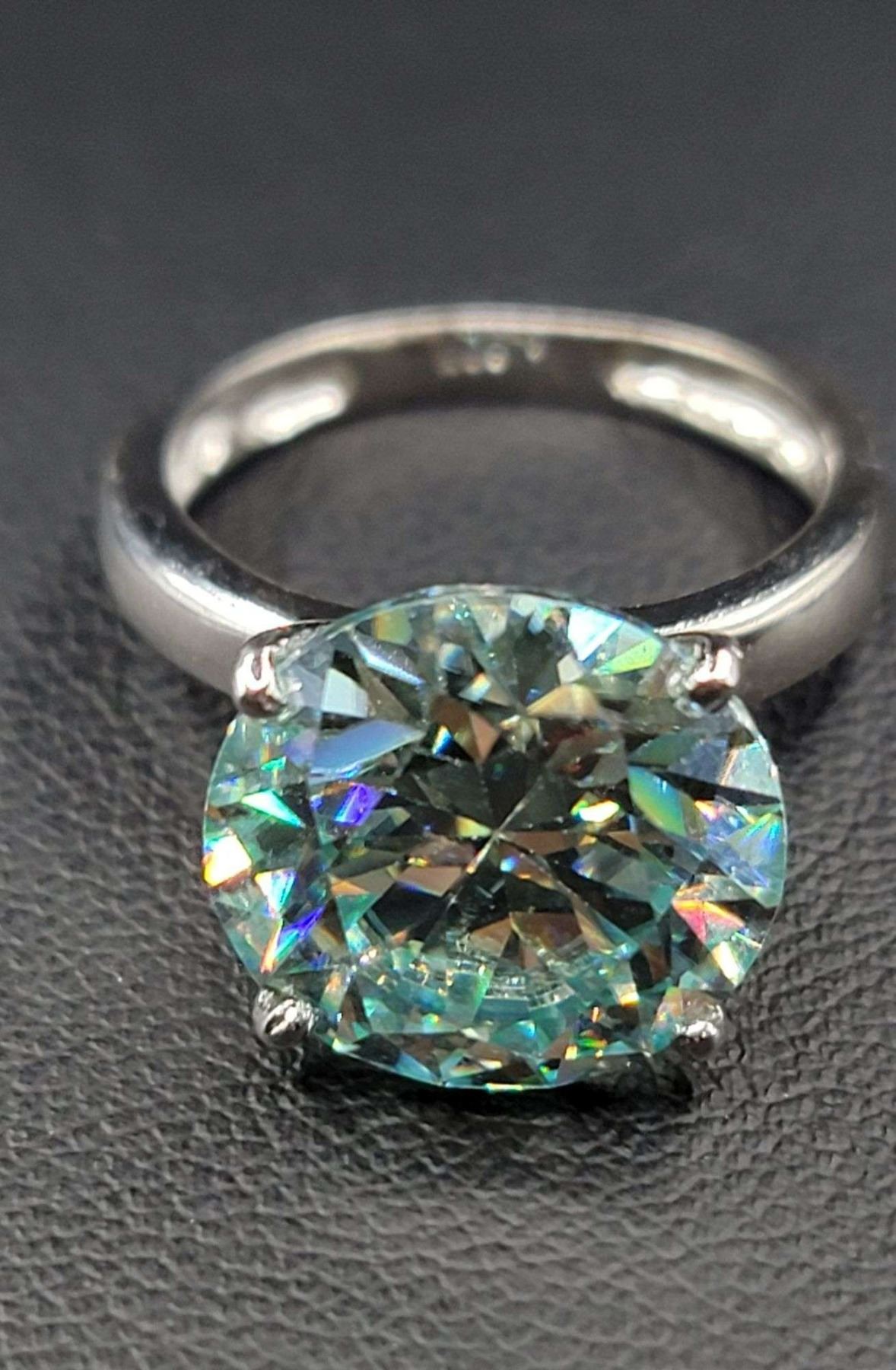 14 Kt White Gold Plate 4.5 Ct Fire Moissanite Ring!!! This Ice Green Fire Moissanite is a VVs1 Brilliant Round Cut. The Color is Paraiba Greenish Blue with a clarity of VVs1.Eye Clean Measuring 10 mm. This Fire bursting out with a full spectrum of colors. It is mounted in 14 Kt White Gold over .925 solid sterling silver. With a refractive index of 2.65-2.69, this Moissanite exhibits more brilliance than a natural diamond thanks to a dispersion that is 2.4 times higher. It is also conflict free and earth friendly. This exceptional Moissanite measures 9.25 on the mohs hardness scale and will test positive for a diamond with almost any diamond tester. Total weight of this ring is 2.5 grams. Ring size 7.5.