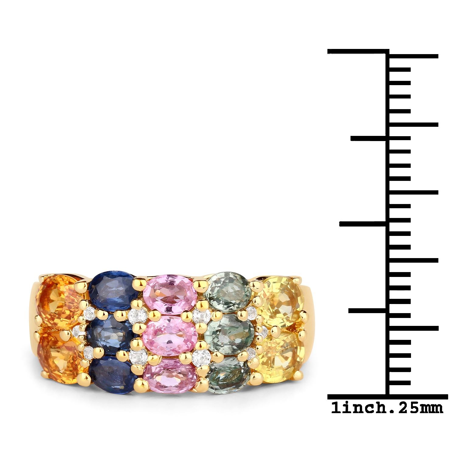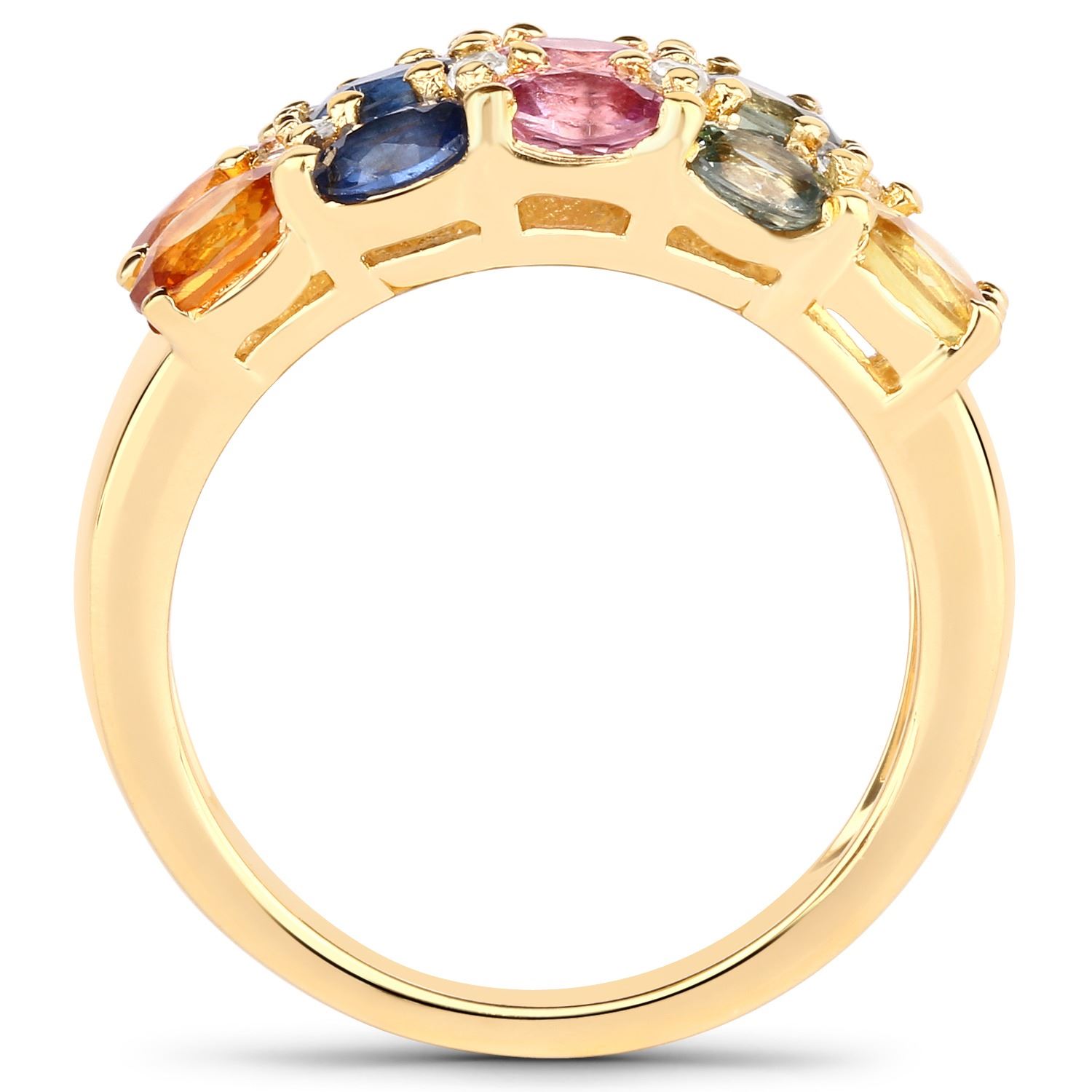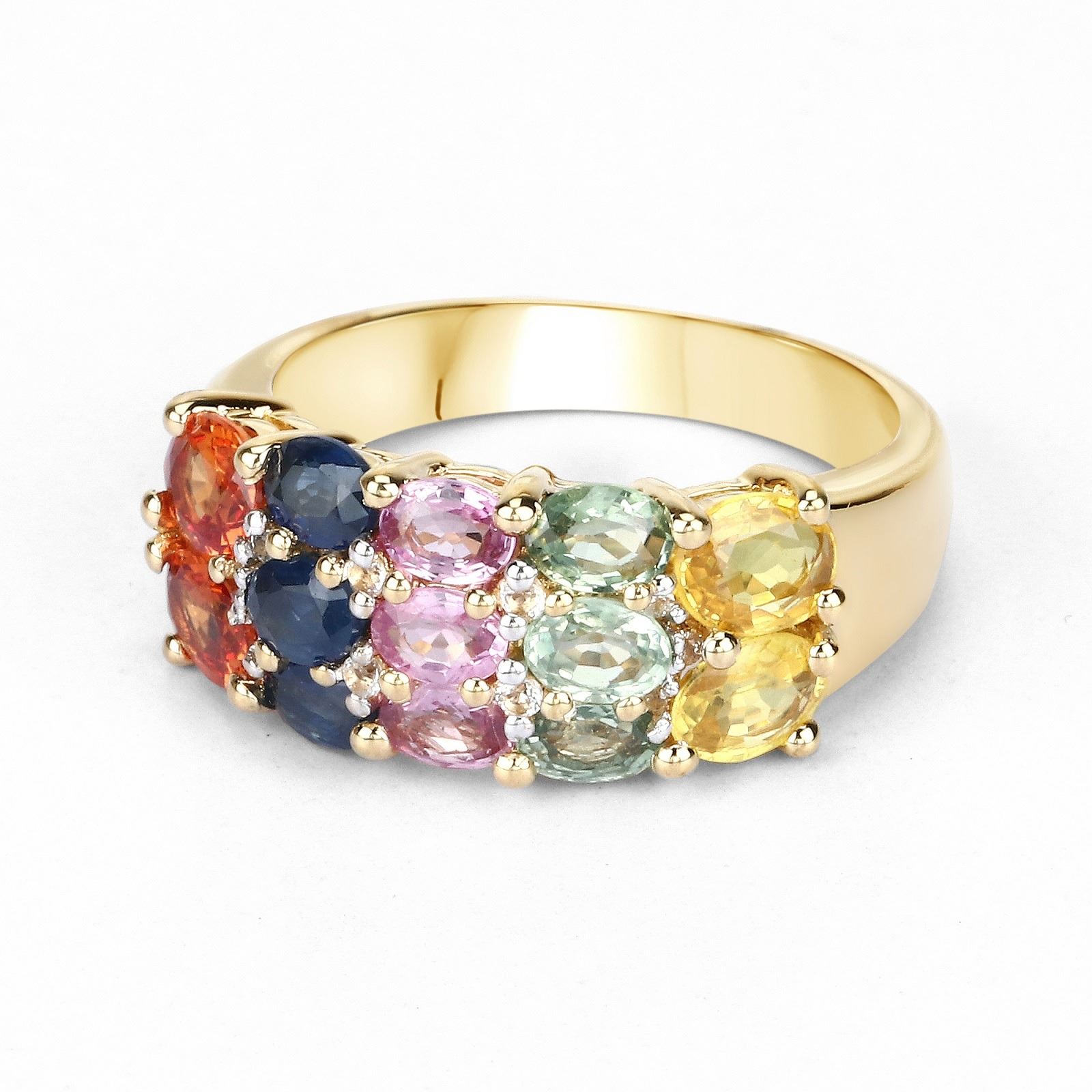 14K Yellow Gold Plated 3.27 Carat Genuine Multi Sapphire .925 Sterling Silver Ring. Yellow Sapphire Oval/5x4mm - 2/0.68 ctw Prong Setting Natural Heat Treated E + Orange Sapphire Oval/5x4mm - 2/0.68 ctw Natural Heat Treated E + Green Sapphire Oval/4x3mm - 3/0.60 ctw Natural Heat Treated E + Pink Sapphire Oval/4x3mm - 3/0.60 ctw Natural Heat Treated E + Blue Sapphire Oval/4x3mm - 3/0.60 ctw Natural Heat Treated E + White Topaz Round/1.40mm - 4/0.08 ctw Natural Heat Treated + White Topaz Round/1.00mm - 6/0.03 ctw Natural Heat Treated. Total weight of this ring is 5.25 grams. Ring size 7.