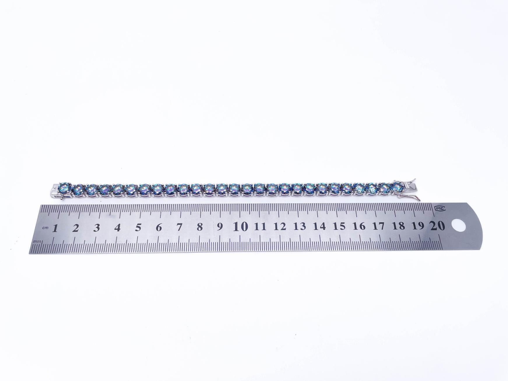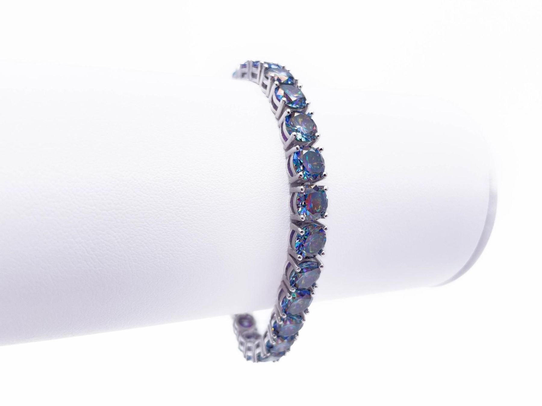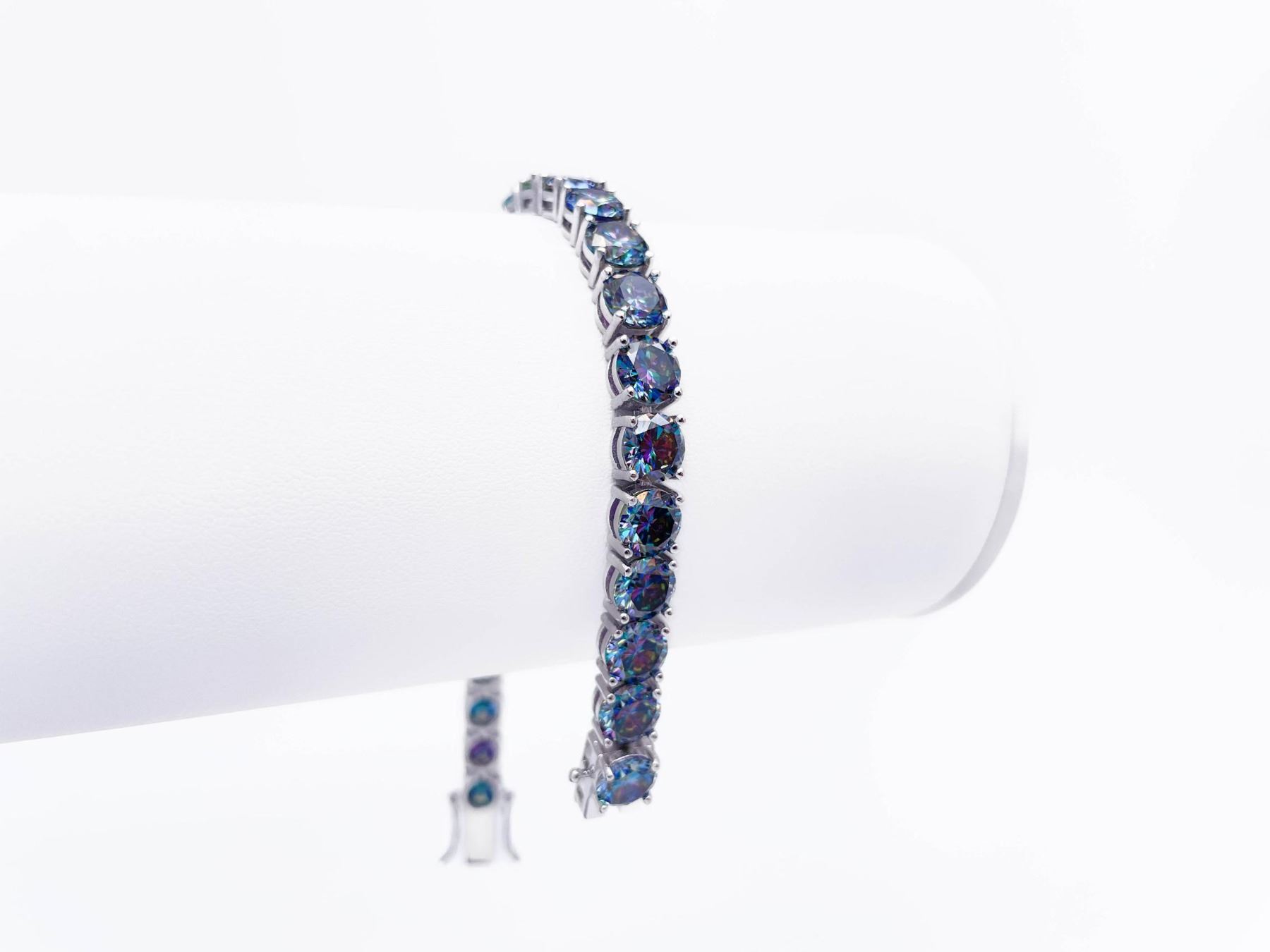18 Kt White Gold Plate 27 Ctw VVs1 Russian Color Change Lab Simulated Alexandrite Tennis Bracelet. These 27 Count Russian Lab Simulated Color Change Alexandrite's are both VVS1 Near Flawless Brilliant Round Cuts. They measure 6.5mm each for a large 27 Ct Total Gem Weight. The color spectrum ranges from beautiful greens, blues, purples, gold and pinks depending on the light and the angle viewed. These Spectacular High End Gems Are Mounted in 18 Kt White Gold over Solid .925 Sterling Silver. They measures 8.5 on the Mohs hardness scale. The length is 7". The gram wt is a stealth 23.6 grams. When this bracelet is worn, it will sparkle and dance with the radiant color changes. Elegant, Yet Sporty , this Bracelet is so right for any occasion. Get ready for the compliments galore on this one.