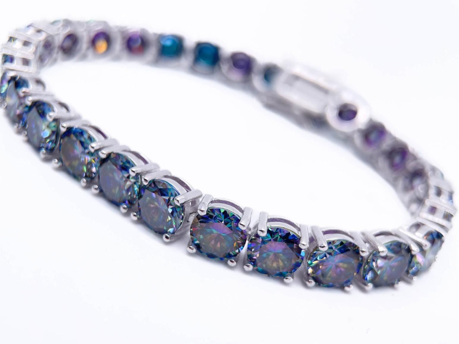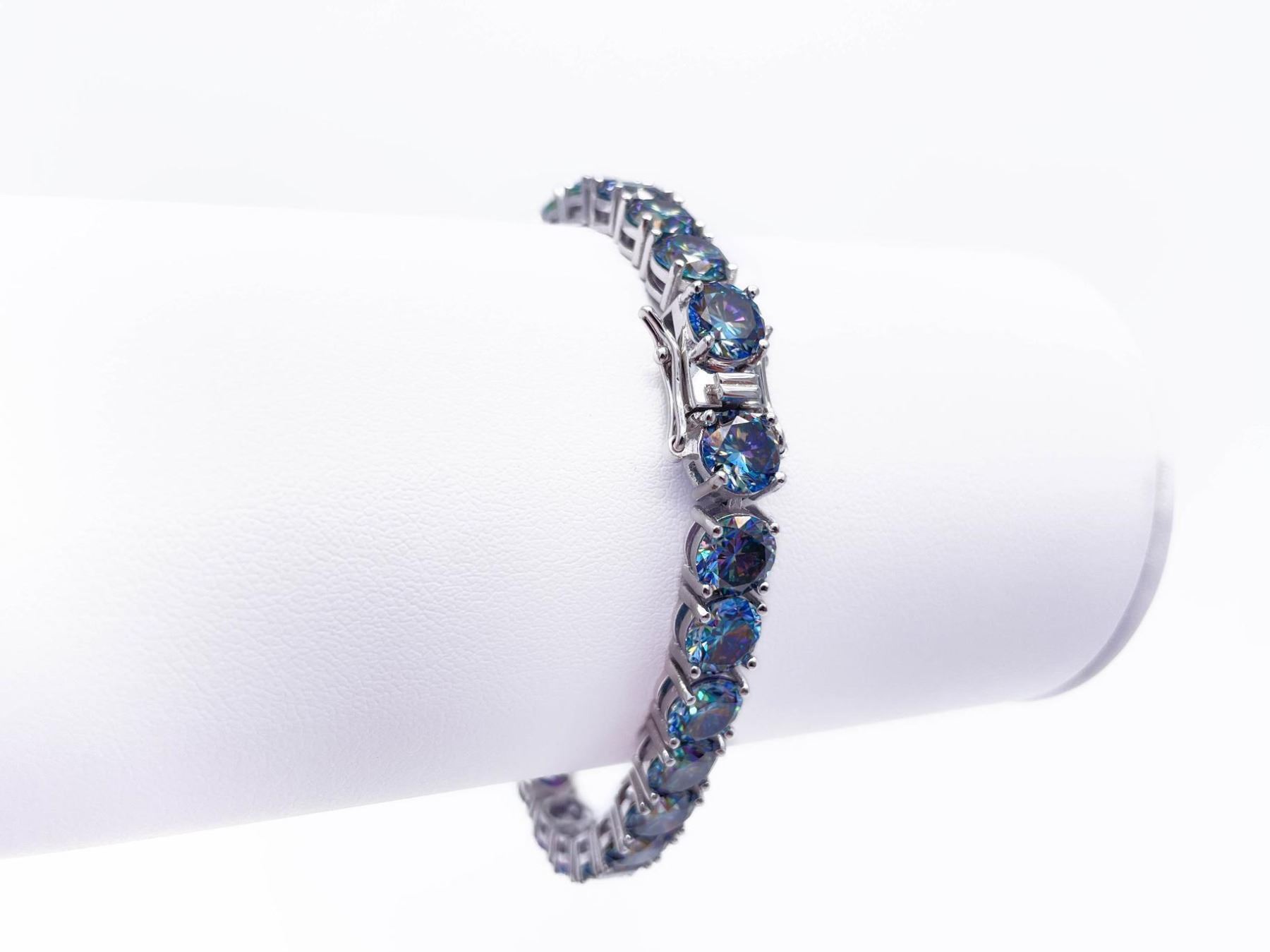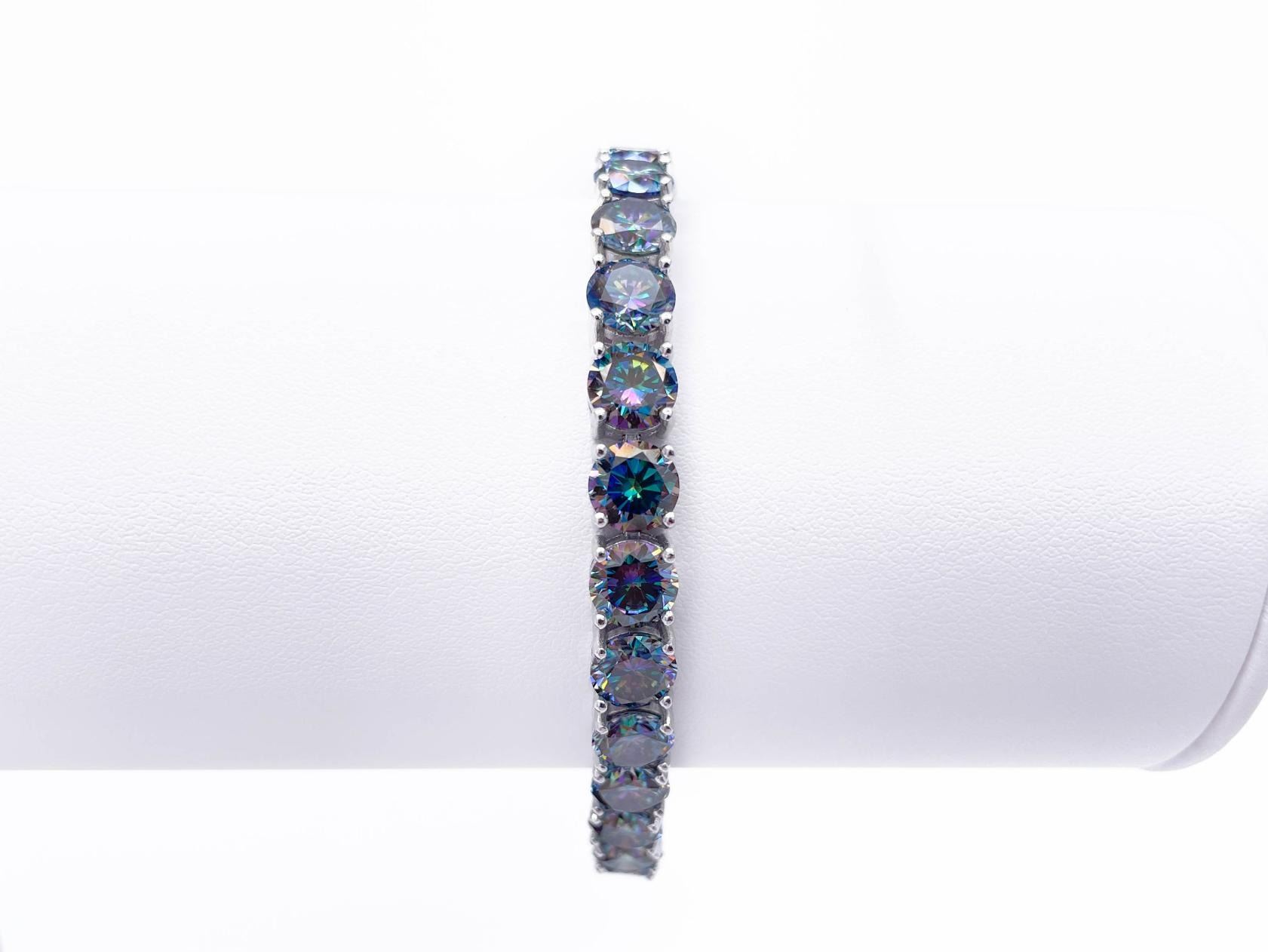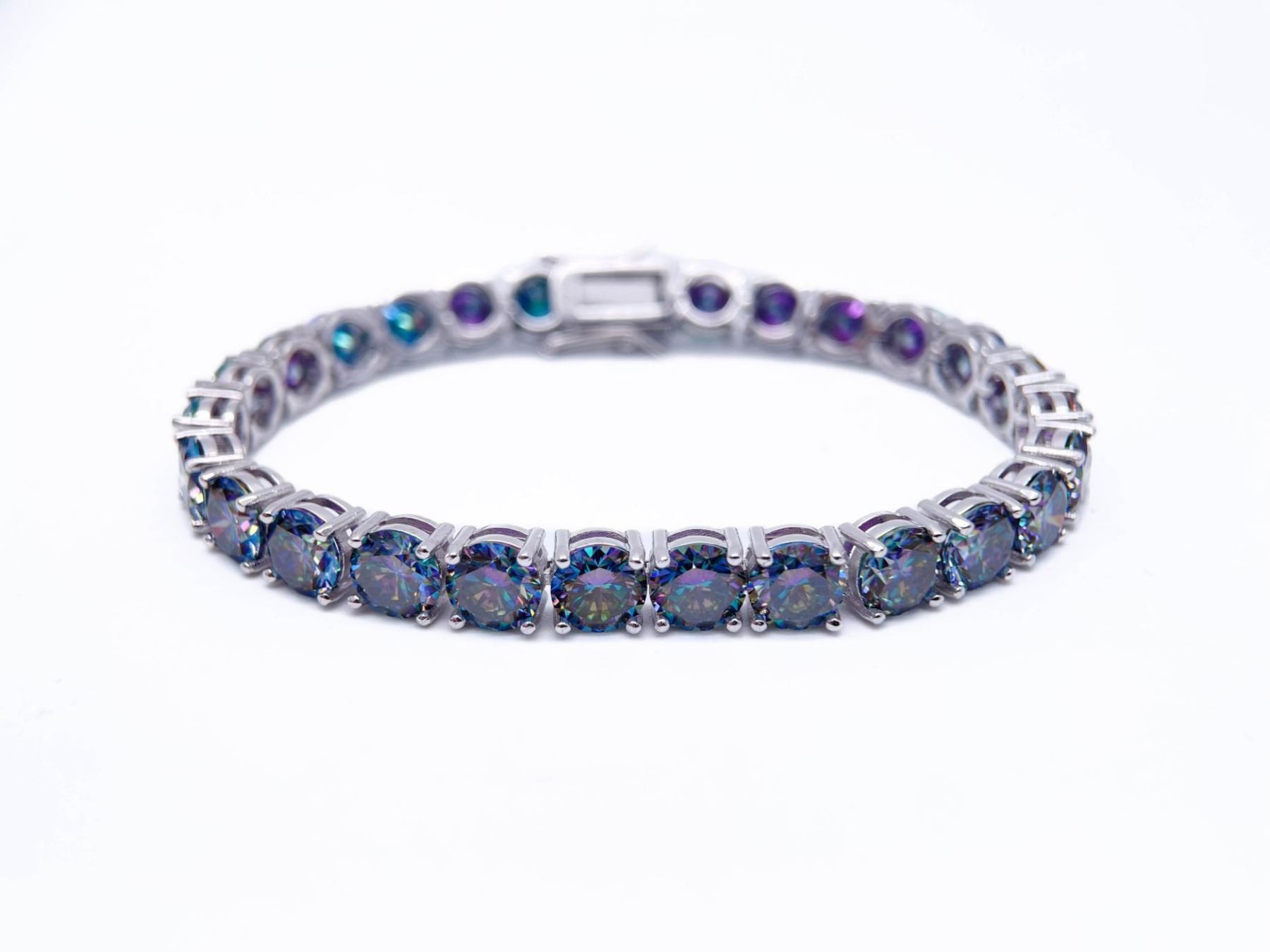 18 Kt White Gold Plate 27 Ctw VVs1 Russian Color Change Lab Simulated Alexandrite Tennis Bracelet. These 27 Count Russian Lab Simulated Color Change Alexandrite's are both VVS1 Near Flawless Brilliant Round Cuts. They measure 6.5mm each for a large 27 Ct Total Gem Weight. The color spectrum ranges from beautiful greens, blues, purples, gold and pinks depending on the light and the angle viewed. These Spectacular High End Gems Are Mounted in 18 Kt White Gold over Solid .925 Sterling Silver. They measures 8.5 on the Mohs hardness scale. The length is 7". The gram wt is a stealth 23.6 grams. When this bracelet is worn, it will sparkle and dance with the radiant color changes. Elegant, Yet Sporty , this Bracelet is so right for any occasion. Get ready for the compliments galore on this one.