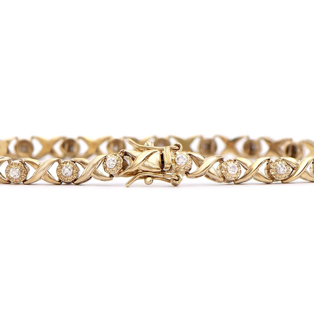 One Plated 18KT Yellow Gold 0.21ctw Diamond Bracelet. (21) Diamonds with a total weight of 0.04cts with a color of I-J and clarity of I-3. Total weight of 11.55 grams of brass layered with 18K yellow gold. The length of this bracelet is 7 1/2 inches.