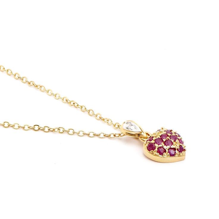 One Plated 18KT Yellow Gold 0.71cts Ruby and Diamond Necklace 18 in. (14) Red Ruby stones with a total weight of 0.7cts. (1) diamonds with a total of 0.01cts with a color of H-I and clarity of I-3. Total weight of this necklace is 2.85 grams.