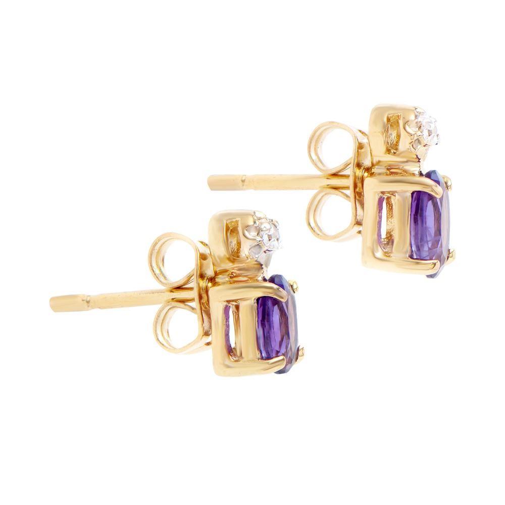 One Plated 18KT Yellow Gold 0.75ctw Amethyst and Diamond Earrings. (2) Amethyst stones with a total weight of 0.75cts. Diamonds with a total weight of 0.015cts with a color of I-J and with a clarity of I3. 1.05 grams of brass layered with 18K yellow gold.