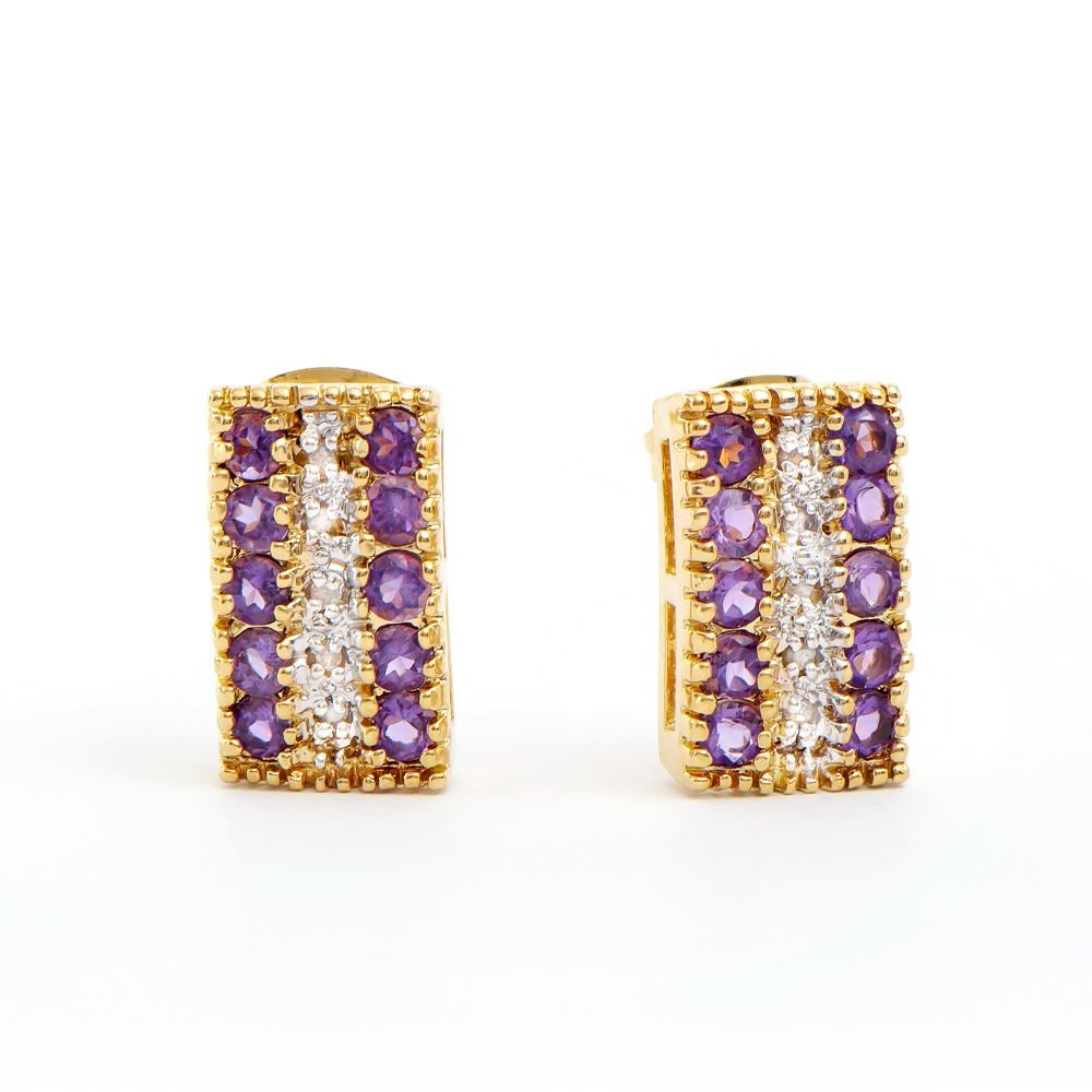 One pair of Plated 18KT Yellow Gold 1.02ctw Amethyst and Diamond Earrings. (20) Amethyst stones with a total weight of 1.79cts. Diamonds with a total weight of 0.08cts with a color of I-J and with a clarity of I3. 2.65 grams of brass layered with 18K yellow gold.