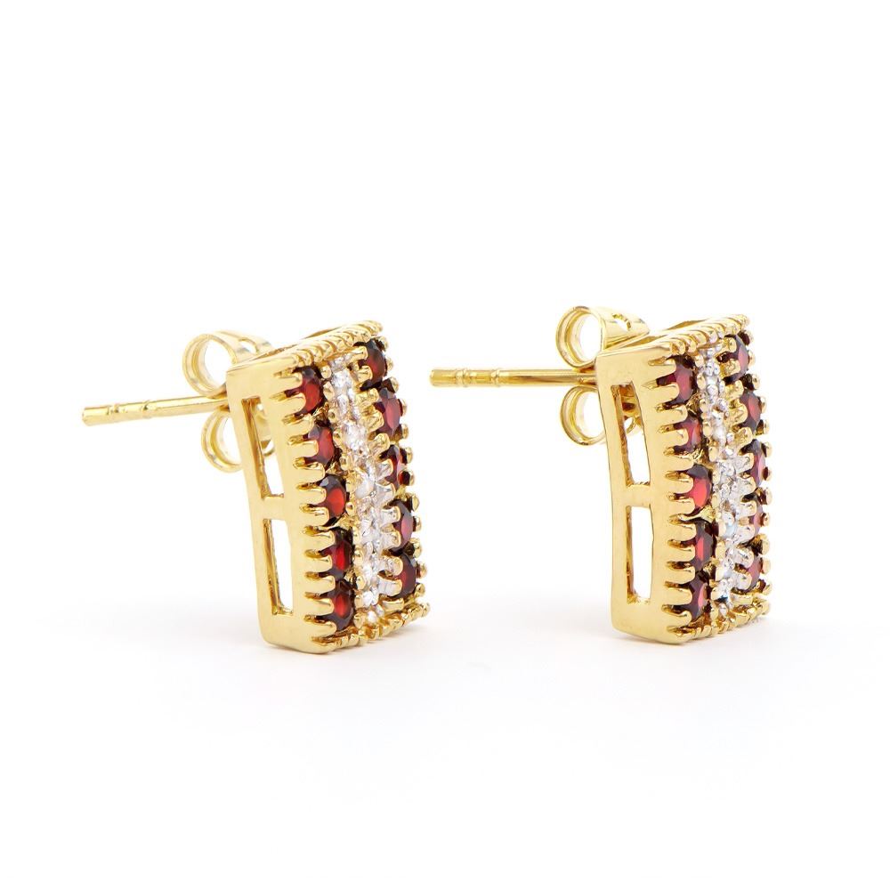 One Plated 18KT Yellow Gold 1.02ctw Garnet and Diamond Earrings. 20 pieces of Round Garnet measuring 2.3mm. 10 pieces of 1.1 mm round diamonds. Total weight of these earrings are 2.65 grams.