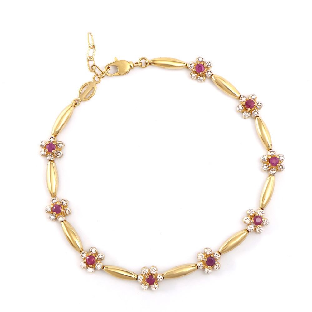 One Plated 18KT Yellow Gold 1.25ctw Ruby and Diamond Bracelet. (9) Rubies with a total weight of 1.25cts. Diamonds with a total weight of 0.13cts with a color of I-J and clarity of I-3. Total weight of this bracelet is 7.55 grams. The length of this bracelet is 7 1/2 inches.