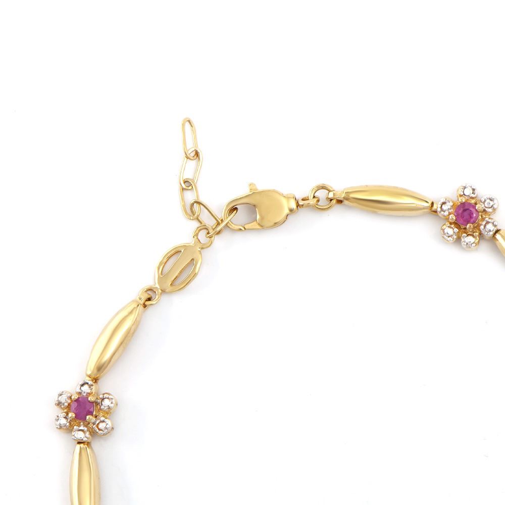 One Plated 18KT Yellow Gold 1.25ctw Ruby and Diamond Bracelet. (9) Rubies with a total weight of 1.25cts. Diamonds with a total weight of 0.13cts with a color of I-J and clarity of I-3. Total weight of this bracelet is 7.55 grams. The length of this bracelet is 7 1/2 inches.