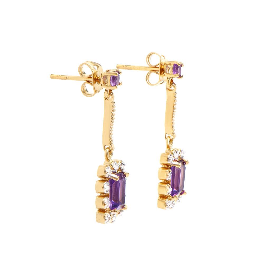 One pair of Plated 18KT Yellow Gold 1.79ctw Amethyst and Diamond Earrings. (4) Amethyst stones with a total weight of 1.79cts. Diamonds with a total weight of 0.15cts with a color of I-J and with a clarity of I3. 2.75 grams of brass layered with 18K yellow gold.
