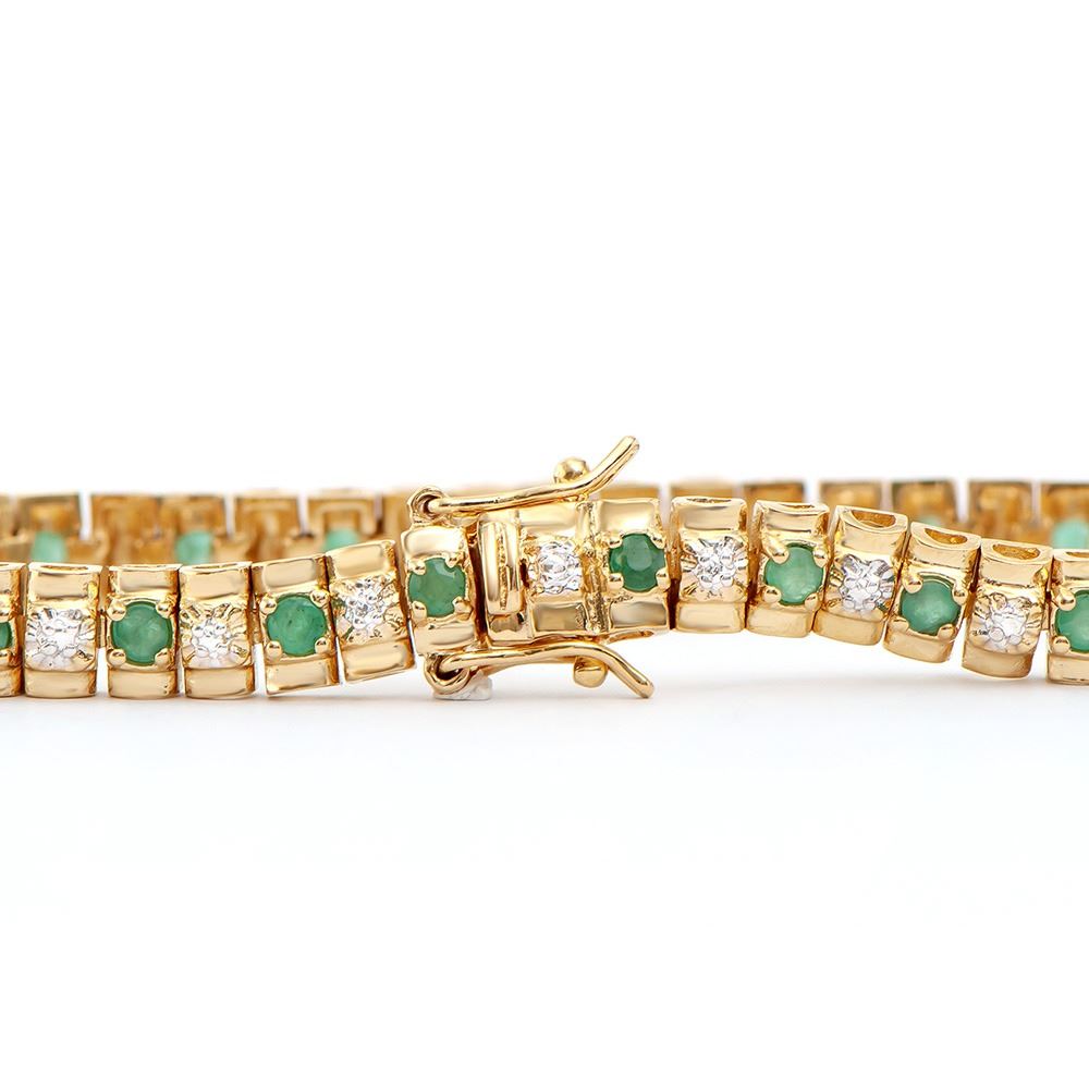 One Plated 18KT Yellow Gold 1.80ctw Emerald and Diamond Bracelet. (27) Emerald stones with a total weight of 1.80cts. Diamonds with a total weight of 0.015cts with a color of I-J and clarity of I-3. Total weight of 14.25 grams of brass layered with 18K yellow gold. The length of this bracelet is 7 1/2 inches.