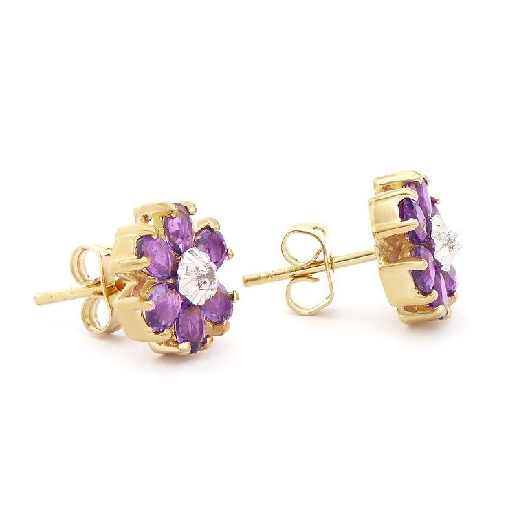 One pair of Plated 18KT Yellow Gold 1.92cts Amethyst and Diamonds Earrings. (12) Violet Amethyst stones with a total weight of 1.9cts. (2) diamonds with a total of 0.02cts with a color of H-I and clarity of I-3. Total weight of these earrings is 3.1 grams.