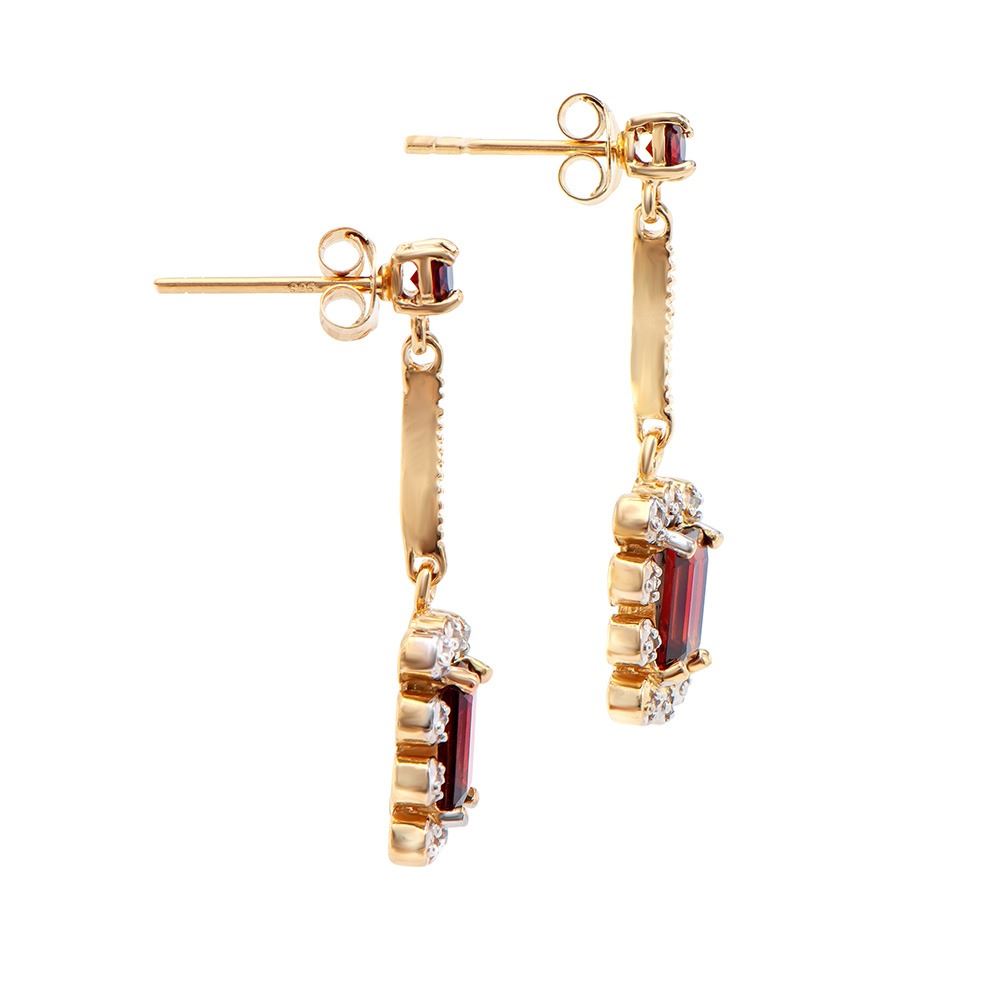 One pair of Plated 18KT Yellow Gold 1.93ctw Garnet and Diamond Earrings. (4) Garnet stones with a total weight of 1.93cts. Diamonds with a total weight of 0.15cts with a color of I-J and with a clarity of I3. 3.05 grams of brass layered with 18K yellow gold.