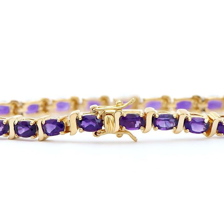 One Plated 18KT Yellow Gold 10.00ctw Amethyst Bracelet. (25) Amethyst stones with a total weight of 10.00cts. Total weight of this bracelet is 14.42 grams. The length of this bracelet is 7 1/2 inches.