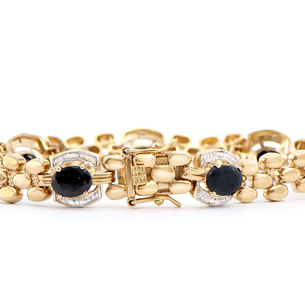 One Plated 18KT Yellow Gold 11.00ctw Black Sapphire and Diamond Bracelet. (7) Black Sapphire stones with a total weight of 11.00cts. (14) Diamonds with a total weight of 0.10cts with a color of I-J and clarity of I-3. Total weight of 19.75 grams of brass layered with 18K yellow gold. The length of this bracelet is 7 1/2 inches.