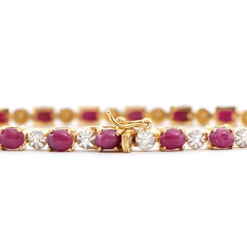 One Plated 18KT Yellow Gold 12.25ctw Ruby and Diamond Bracelet. (21) Rubies with a total weight of 12.25cts. Diamonds with a total weight of 0.015cts with a color of I-J and with a clarity of I3. Total weight of this bracelet is 11.75 grams of brass layered with 18K yellow gold. The length of this bracelet is 7 1/2 inches.