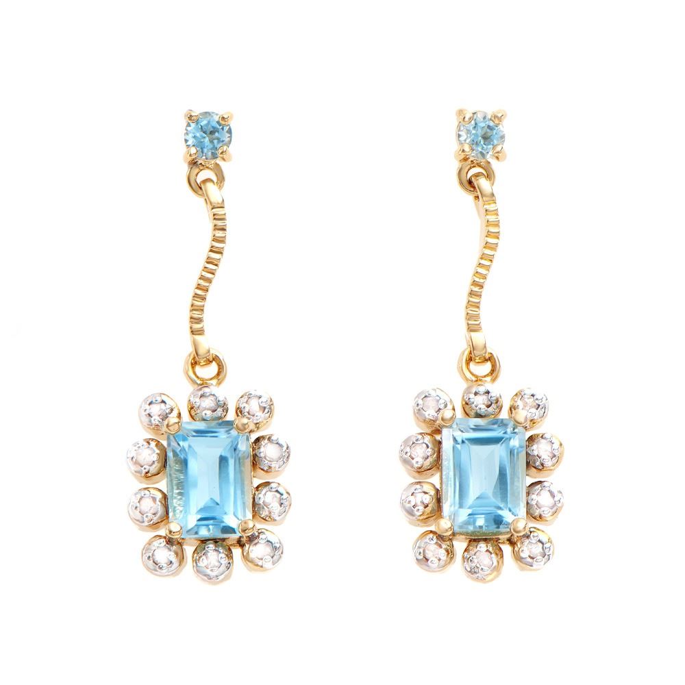 One pair of Plated 18KT Yellow Gold 2.06ctw Blue Topaz and Diamond Earrings. (4) Amethyst stones with a total weight of 2.06cts. Diamonds with a total weight of 0.15cts with a color of I-J and with a clarity of I3. 3.05 grams of brass layered with 18K yellow gold.