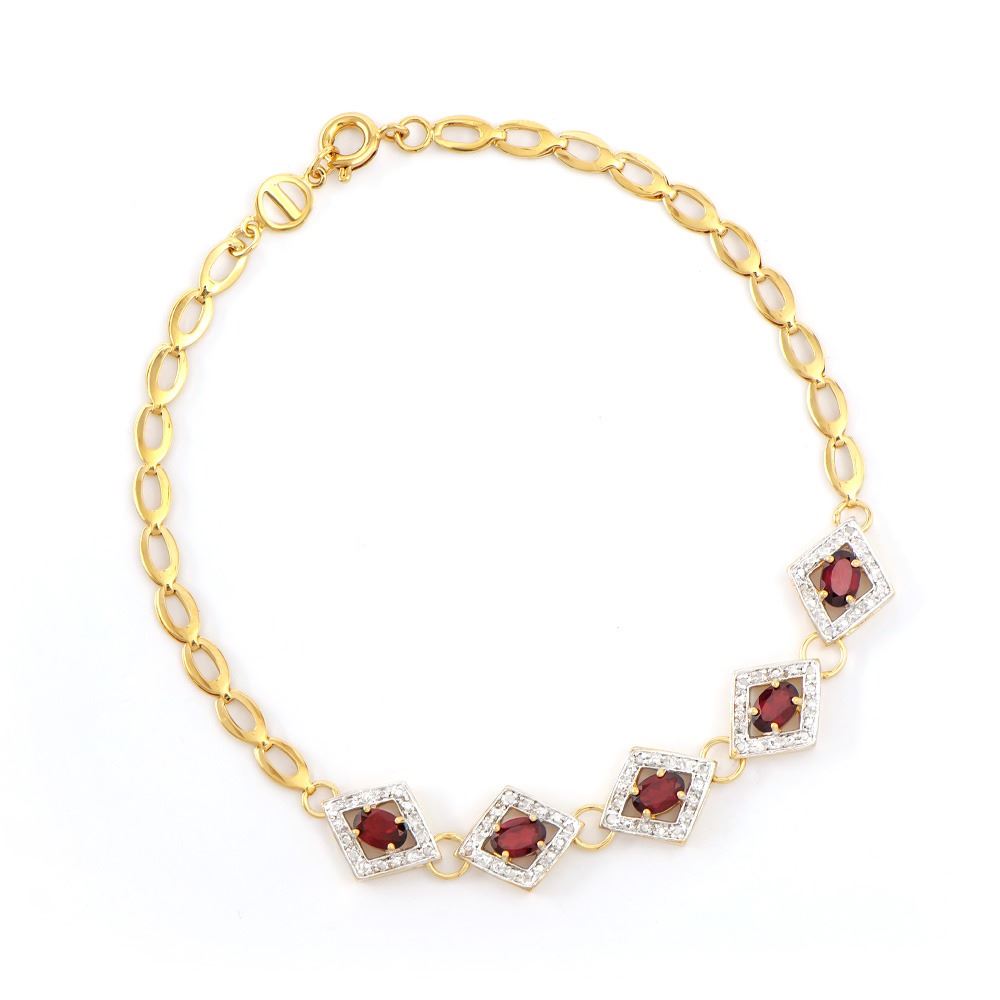 One Plated 18KT Yellow Gold 2.25ctw Garnet and Diamond Bracelet. (5) Garnet stones with a total weight of 2.25cts. Diamonds with a total weight of 0.15cts with a color of I-J and clarity of I-3. Total weight of this bracelet is 5.75 grams. The length of this bracelet is 7 1/2 inches.