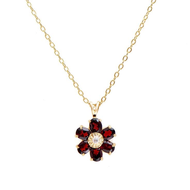 One Plated 18KT Yellow Gold 2.26cts Garnet and Diamond Necklace 18 in. (6) Brown Garnet stones with a total weight of 2.25cts. (1) diamonds with a total of 0.01cts with a color of H-I and clarity of I-3. Total weight of this necklace is 3.21 grams.