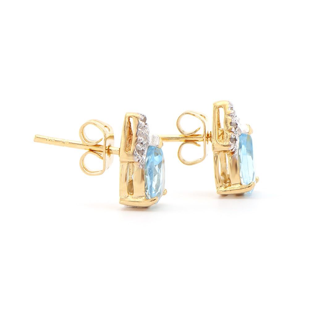 One pair of Plated 18KT Yellow Gold 2.65ctw Blue Topaz and Diamond Earrings. (2) Blue Topaz stones with a total weight of 2.65cts. Diamonds with a total weight of 0.08cts with a color of I-J and with a clarity of I3. 1.65 grams of brass layered with 18K yellow gold.