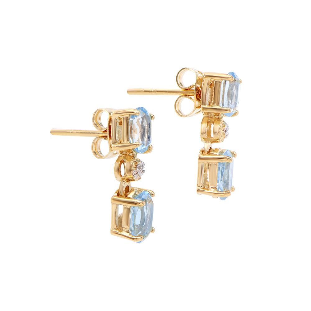 One pair of Plated 18KT Yellow Gold 2.80ctw Blue Topaz and Diamond Earrings. (4) Blue Topaz stones with a total weight of 2.80cts. Diamonds with a total weight of 0.015cts with a color of I-J and with a clarity of I3. 1.95 grams of brass layered with 18K yellow gold.