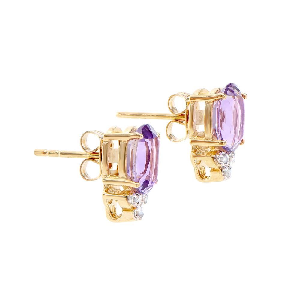 One Plated 18KT Yellow Gold 2.95ctw Amethyst and Diamond Earrings. (2) Amethyst stones with a total weight of 2.95cts. Diamonds with a total weight of 0.06cts with a color of I-J and with a clarity of I3. 2.05 grams of brass layered with 18K yellow gold.