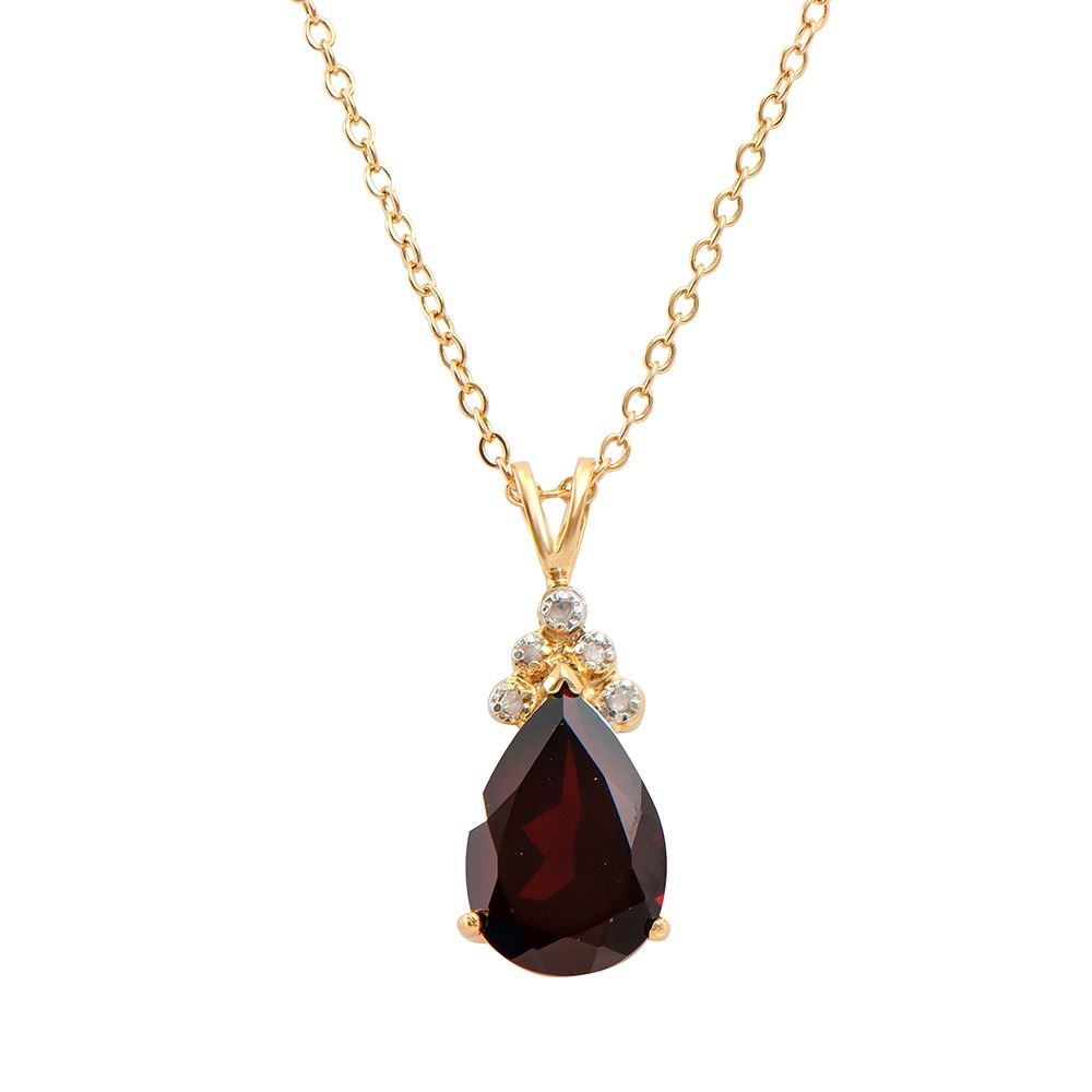 One Plated 18KT Yellow Gold 3.25ctw Garnet and Diamond Pendant with Chain. (1) Garnet stone with a total weight of 3.25cts. Diamonds with a total weight of 0.03cts with a color of I-J and clarity of I-3. Total weight of 3.85 grams of brass layered with 18K yellow gold.