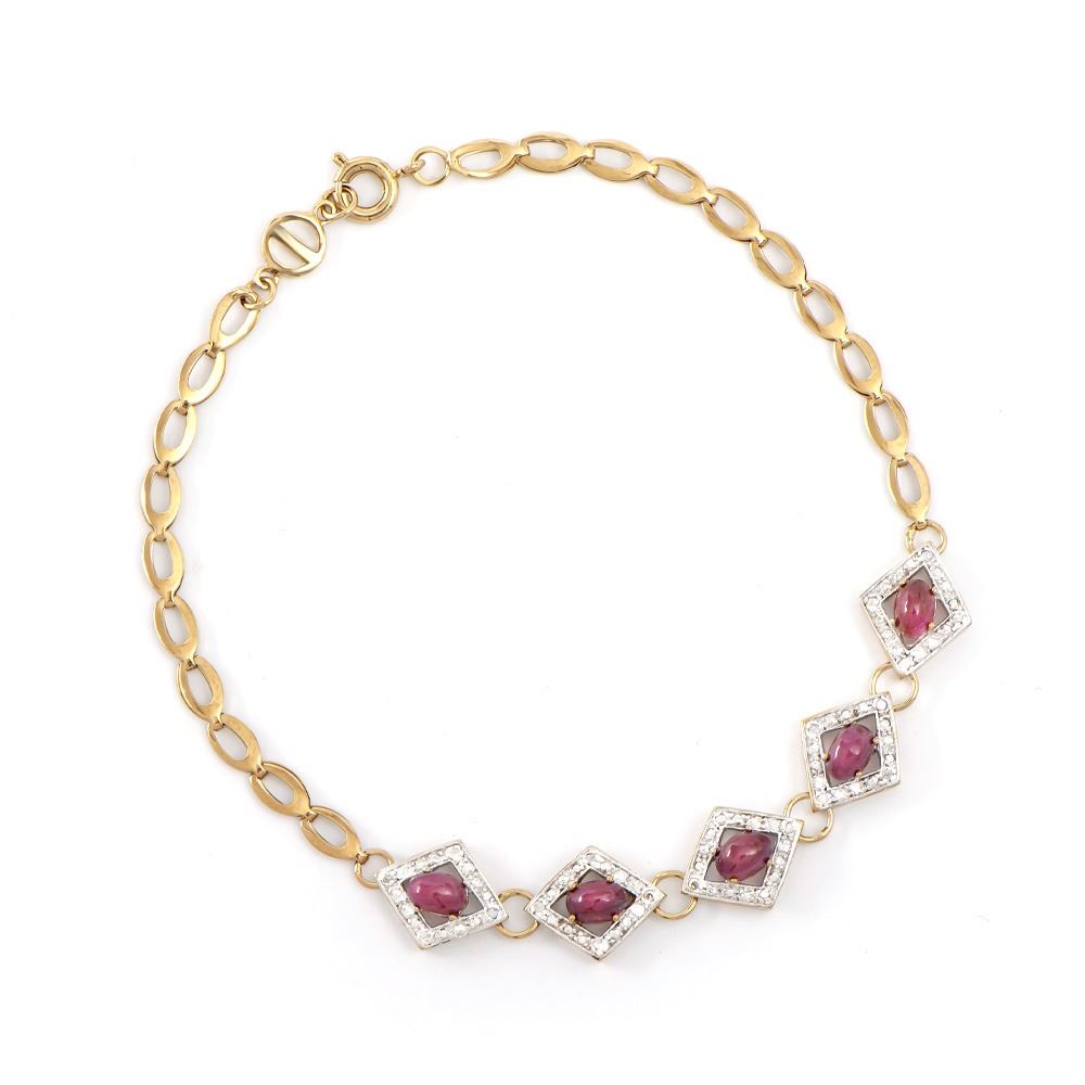 One Plated 18KT Yellow Gold 3.25ctw Ruby and Diamond Bracelet. (5) Rubies with a total weight of 3.25cts. Diamonds with a total weight of 0.15cts with a color of I-J and clarity of I-3. Total weight of this bracelet is 5.75 grams. The length of this bracelet is 7 1/2 inches.