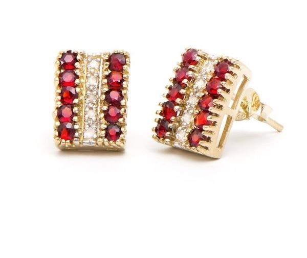 One Plated 18KT Yellow Gold 3.37ctw Garnet and Diamond Earrings. 20 pieces of Round Garnet measuring 1.8mm. 10 pieces of 1.1 mm faceted round diamonds. 4.88 grams of silver layered with 18K yellow gold.