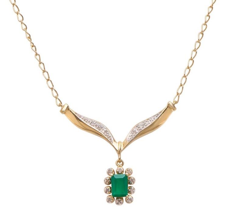 One Plated 18KT Yellow Gold 3.78ct Green Agate and Diamond Pendant with Chain. (1) Emerald-cut Green Agate 3x2mm. (6) round diamonds measuring 1.0mm. 6.74 grams of brass layered with 18K yellow gold.