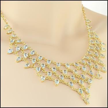 One Plated 18KT Yellow Gold 30.25ctw Blue Topaz Pendant with Chain. (59) Blue Topaz stones with a total weight of 30.25cts. Total weight of 27.55 grams of brass layered with 18K yellow gold.