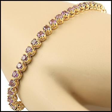 One Plated 18KT Yellow Gold 4.45ctw Amethyst Bracelet. (46) Amethyst stones with a total weight of 4.45cts. Total weight of 8.25 grams of brass layered with 18K yellow gold. The length of this bracelet is 7 1/2 inches.
