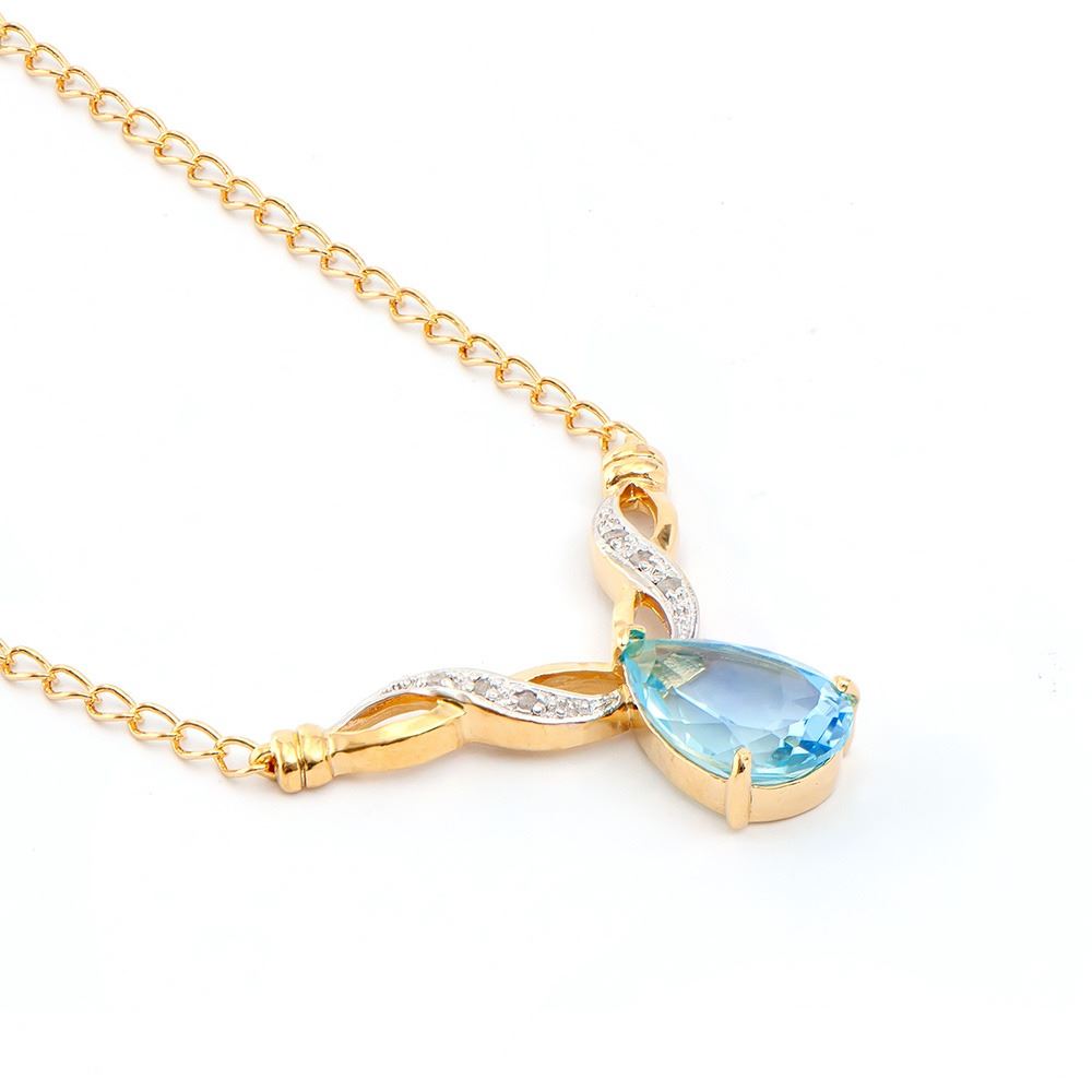One Plated 18KT Yellow Gold 4.75ctw Blue Topaz and Diamond Pendant with Chain. (1) Blue Topaz stone with a total weight of 4.75cts. Diamonds with a total weight of 0.05cts with a color of I-J and clarity of I-3.Total weight of 5.25 grams of brass layered with 18K yellow gold.