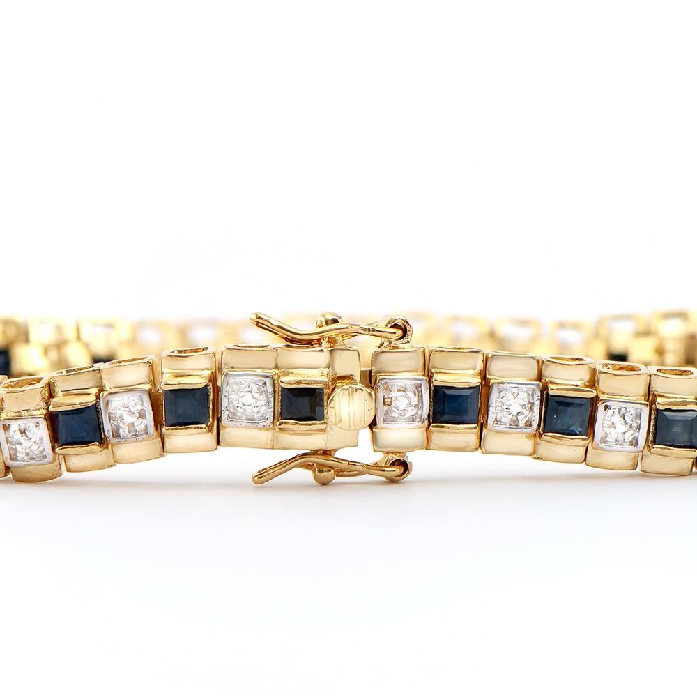 One Plated 18KT Yellow Gold 5.00ctw Black Sapphire and Diamond Bracelet. (25) Black Sapphire stones with a total weight of 5.00cts. (4) Diamonds with a total weight of 0.04cts with a color of I-J and clarity of I-3. Total weight of 17.25 grams of brass layered with 18K yellow gold. The length of this bracelet is 7 1/2 inches.