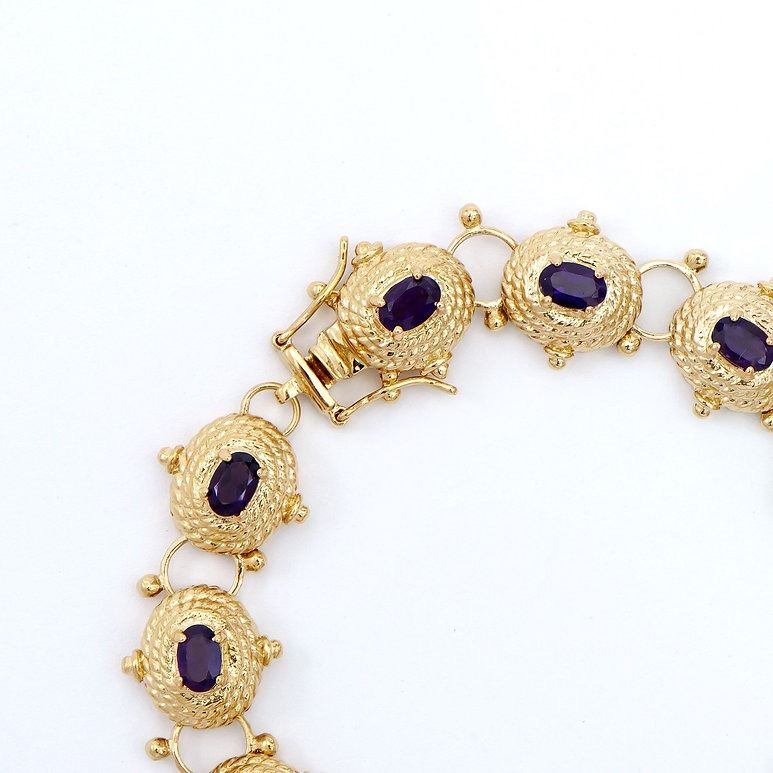 One Plated 18KT Yellow Gold 5.05cts Amethyst Bracelet 8 in. (12) Violet Amethyst stones with a total weight of 5.05cts. Total weight of this bracelet is 21.17 grams.