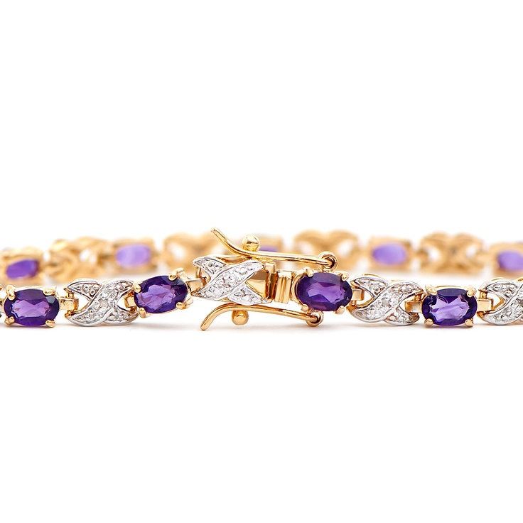 One Plated 18KT Yellow Gold 5.31cts Amethyst and Diamond Bracelet 7.5 in. (13) Violet Amethyst stones with a total weight of 5.2cts. (13) diamonds with a total of 0.11cts with a color of H-I and clarity of I-3. Total weight of this bracelet is 9.36 grams.