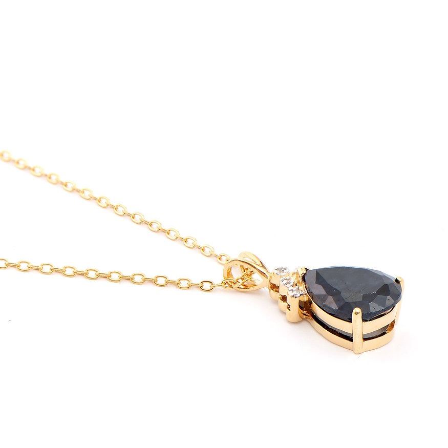 One Plated 18KT Yellow Gold 6.06cts Black Sapphire and Diamond Pendant with Chain. (1) Black sapphire center stone with a total weight of 6.06cts. (5) diamonds with a total of 0.05cts with a color of H-I and clarity of I-3. Total weight of pendant with chain is 4.8 grams. Length of chain is 18 inches.