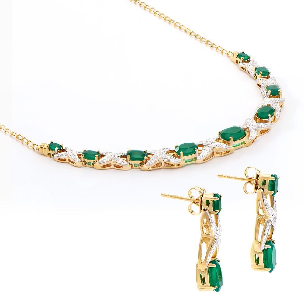 One Plated 18KT Yellow Gold 6.10ctw Green Agate and Diamond Pendant with Chain and Earrings. (11) Green Agate stones with a total weight of 6.10cts. (10) diamonds with a total weight of 0.08cts with a color of I-J and clarity of I-3. 12.55 grams of brass layered with 18K yellow gold.