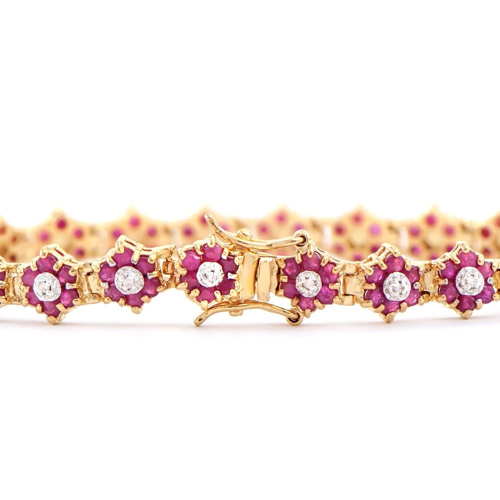 One Plated 18KT Yellow Gold 6.55ctw Ruby and Diamond Bracelet. (132) Rubies with a total weight of 6.55cts. Diamonds with a total weight of 0.16cts with a color of I-J and with a clarity of I3. Total weight of this bracelet is 12.25 grams of brass layered with 18K yellow gold. The length of this bracelet is 7 1/2 inches.