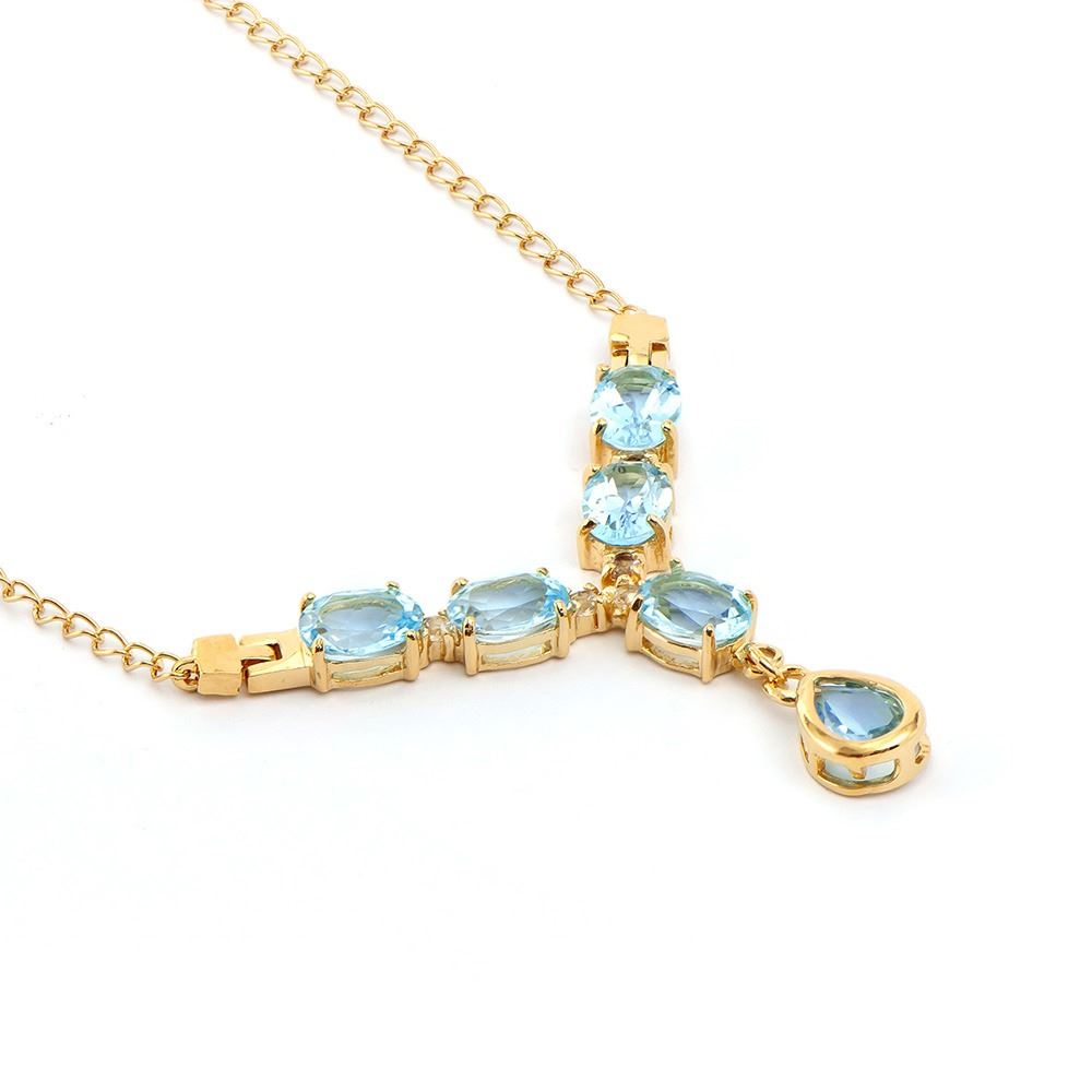 One Plated 18KT Yellow Gold 8.00ctw Blue and whiteTopaz Pendant with Chain. (6) Blue Topaz stones with a total weight of 8.00cts. (5) white topaz stones with a total weight of 0.25cts. 6.85 grams of brass layered with 18K yellow gold.