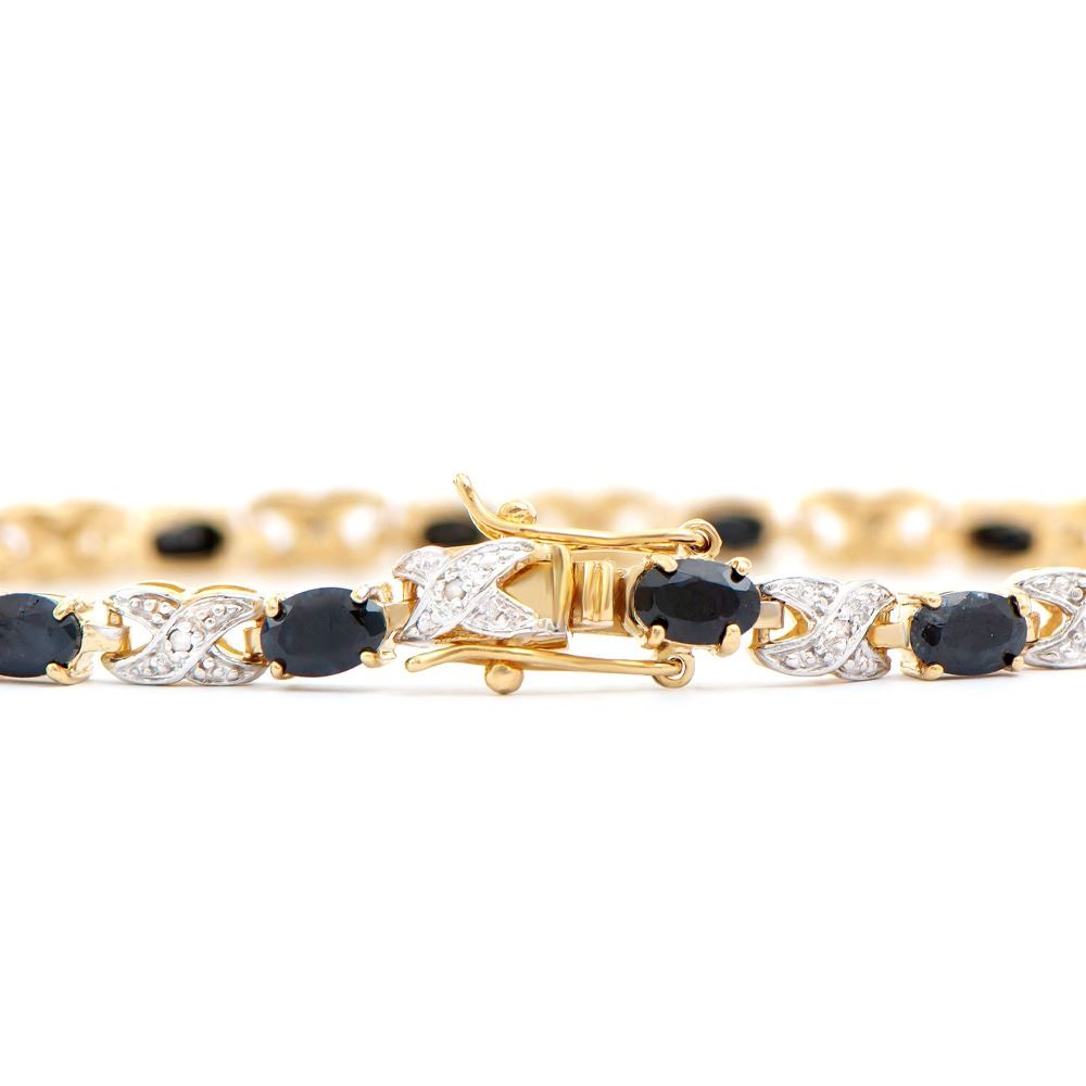 One Plated 18KT Yellow Gold 8.25ctw Black Sapphire and Diamond Bracelet. (13) Black Sapphire stones with a total weight of 8.25cts. Diamonds with a total weight of 0.10cts with a color of I-J and clarity of I-3. Total weight of this bracelet is 9.55 grams. The length of this bracelet is 7 1/2 inches.