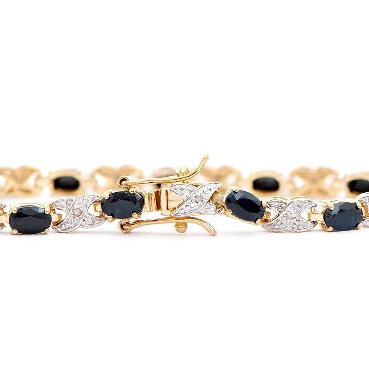 One Plated 18KT Yellow Gold 8.25ctw Black Sapphire and Diamond Bracelet. (13) Black Sapphire stones with a total weight of 8.25cts. (13) Diamonds with a total weight of 0.11cts with a color of H-I and clarity of I-3. Total weight of this bracelet is 9.66 grams. Length of bracelet is 7.5 inches.
