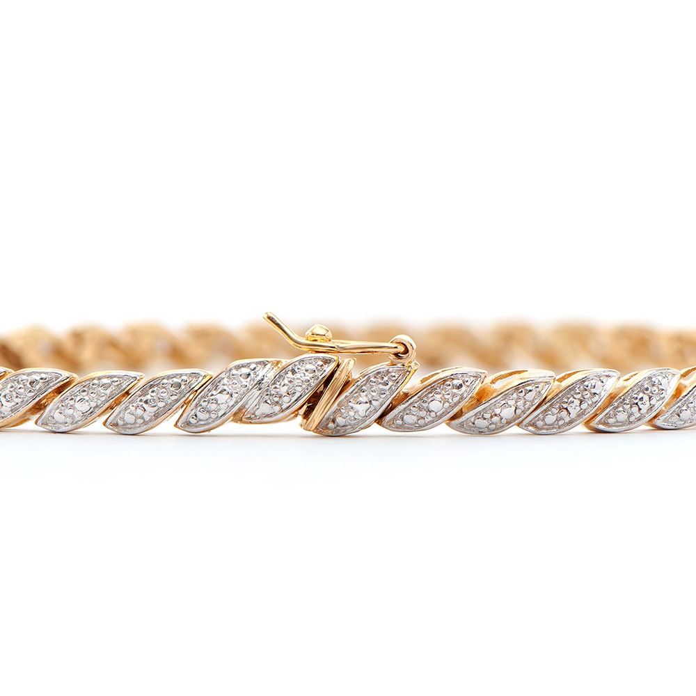 One Plated 18KT Yellow Gold Diamond Bracelet. Diamonds with a total weight of 0.015cts with a color of I-J and with a clarity of I3. Total weight of this bracelet is 9.05 grams of brass layered with 18K yellow gold. The length of this bracelet is 7 1/2 inches.