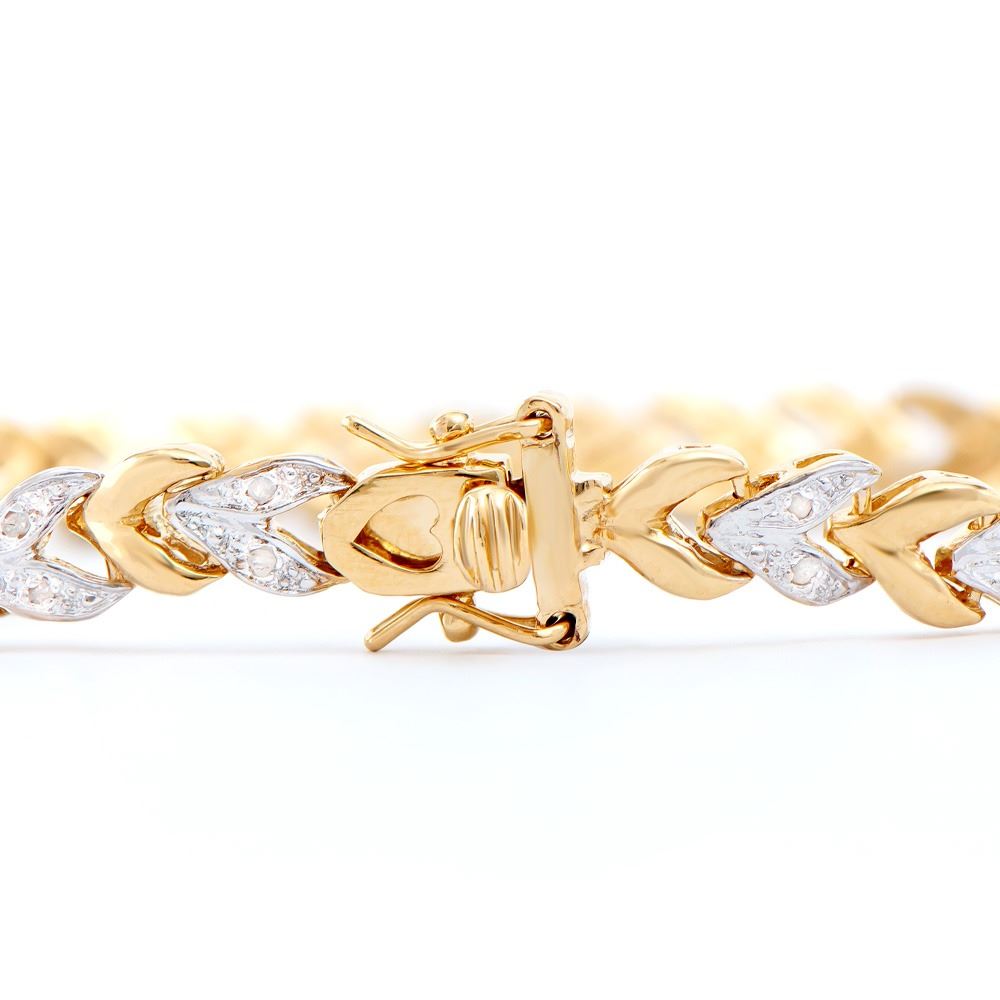 One Plated 18KT Yellow Gold Diamond Bracelet. Diamonds with a total weight of 0.26cts with a color of I-J and with a clarity of I3. Total weight of this bracelet is 11.25 grams of brass layered with 18K yellow gold. The length of this bracelet is 7 1/2 inches.