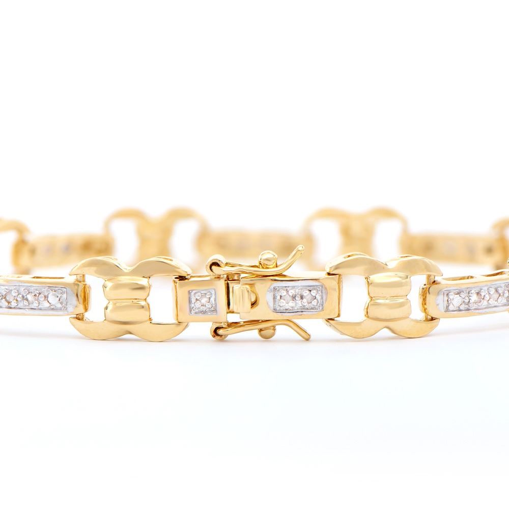 One Plated 18KT Yellow Gold Diamond Bracelet. Diamonds with a total weight of 0.012cts with a color of I-J and with a clarity of I3. Total weight of this bracelet is 9.75 grams of brass layered with 18K yellow gold. The length of this bracelet is 7 1/2 inches.