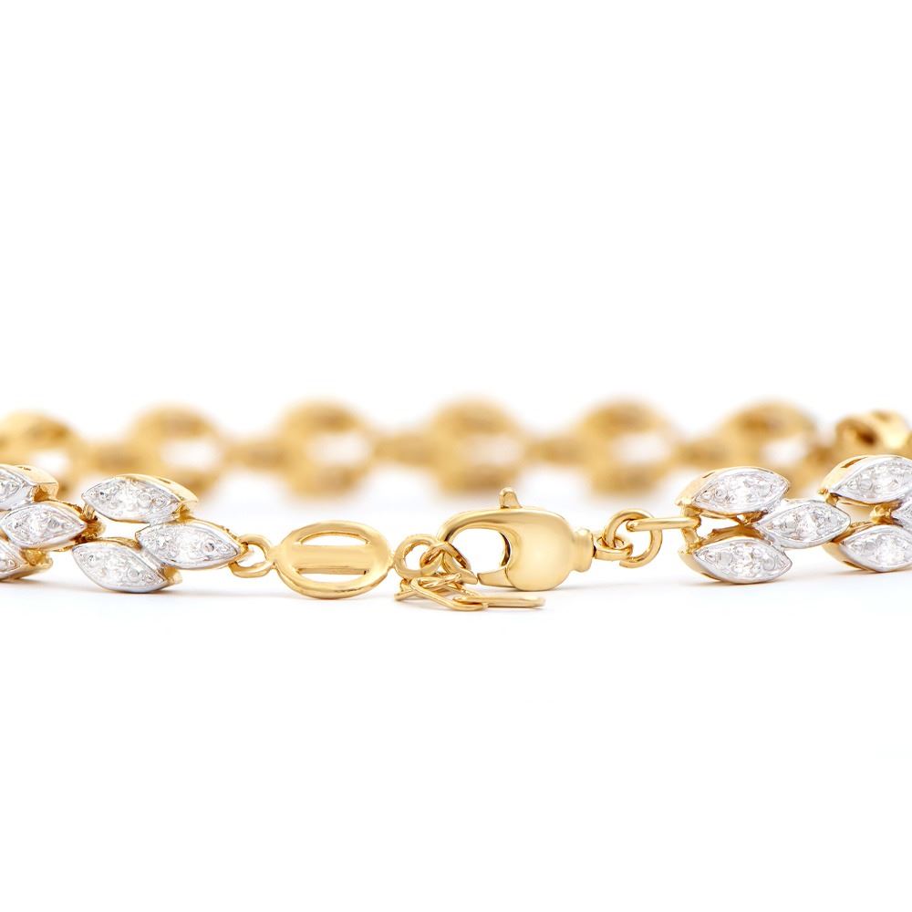 One Plated 18KT Yellow Gold Diamond Bracelet. Diamonds with a total weight of 0.18cts with a color of I-J and with a clarity of I3. Total weight of this bracelet is 10.05 grams of brass layered with 18K yellow gold. The length of this bracelet is 7 1/2 inches.