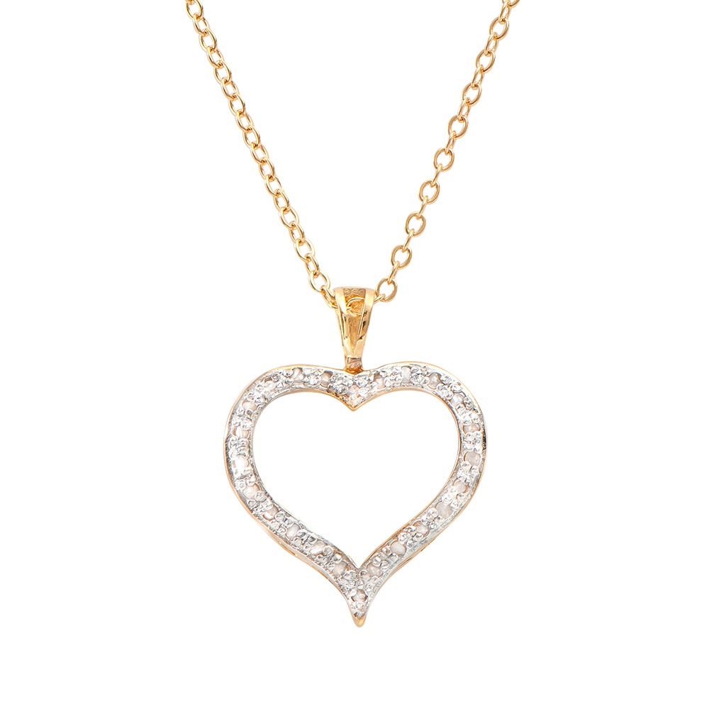 One Plated 18KT Yellow Gold Diamond Heart Pendant with Chain. (24) Diamonds with a total weight of 0.18cts with a color of I-J and clarity of I-3. Total weight of 3.15 grams of brass layered with 18K yellow gold.
