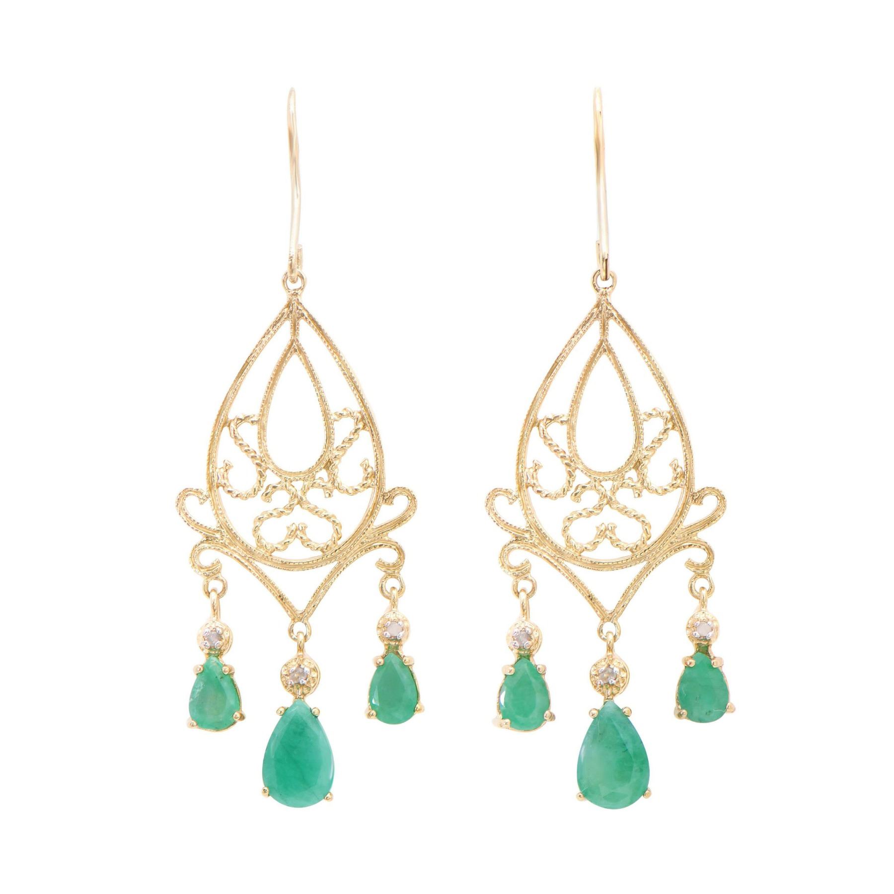 (2) Pear shaped Emeralds with a total weight of 2.75cts. (4) Pear shaped Emeralds with a total weight of 1.76cts. (6) round Diamonds with a total weight of 0.06cts with a color of H-I and clarity of i3. Total weight of these earrings are 5.90 grams.