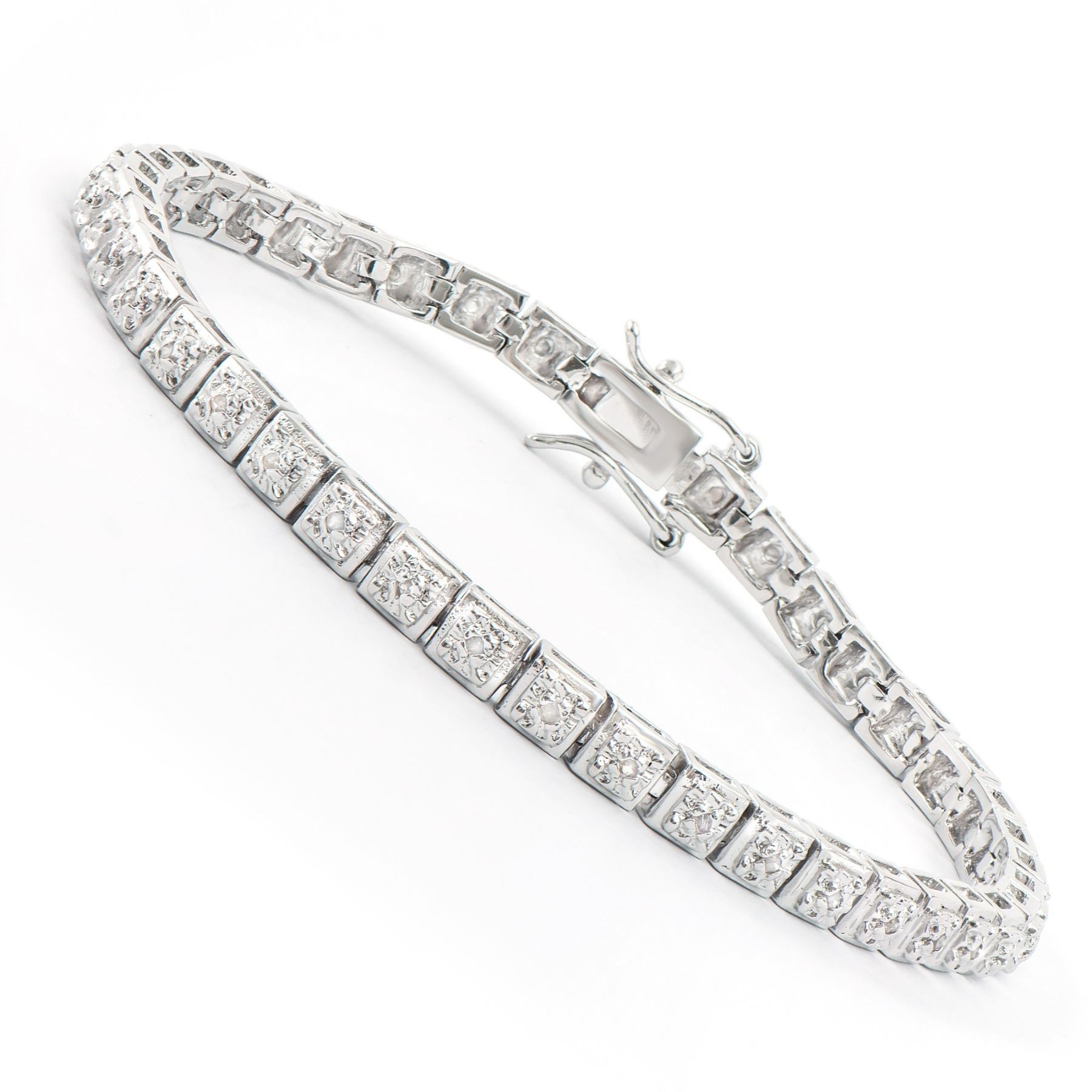 One Plated Rhodium 0.32ctw Diamond Bracelet. (41) single cut round Diamonds with a color of I-J and clarity of I-3 measuring 1.1mm. 10.55 grams of brass layered with Rhodium. The length of this bracelet is 7 1/2 inches.