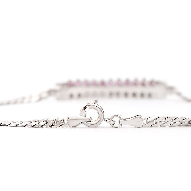 One Plated 0.6 TWcts Ruby and Diamonds Rhodium Bracelet. (11) Red Ruby stones with a total weight of 0.51cts. (11) diamonds with a total of 0.09cts with a color of H-I and clarity of I-3. Total weight of this bracelet is 4.45 grams.